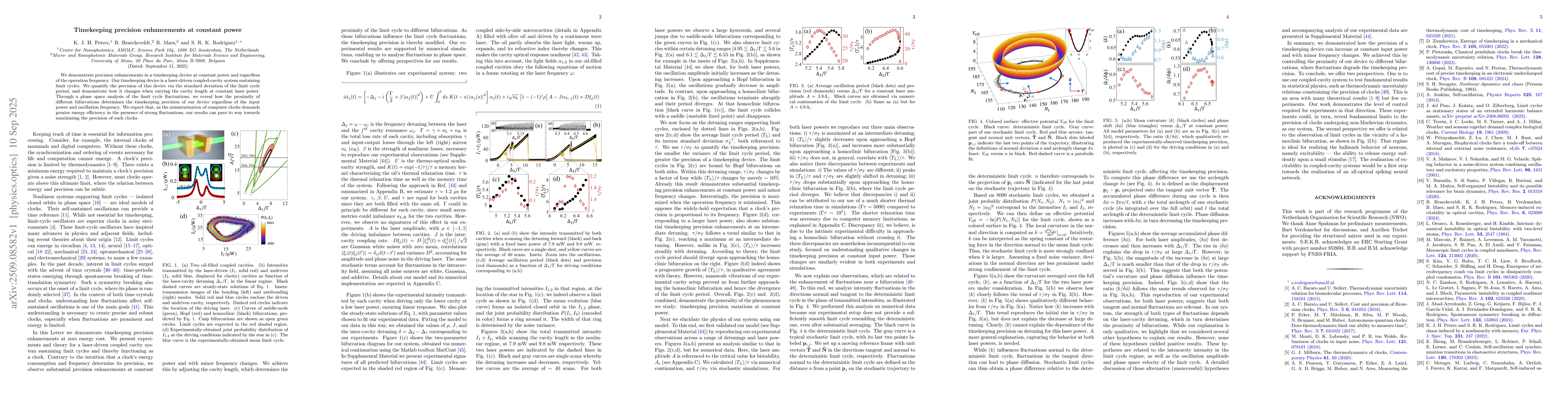 We demonstrate precision enhancements in a timekeeping device at constant power and regardless of the operation frequency. Our timekeeping device is a laser-driven coupled-cavity system sustaining limit cycles. We quantify the precision of this device via the standard deviation of the limit cycle period, and demonstrate how it changes when varying the cavity length at constant laser power. Through a phase space analysis of the limit cycle fluctuations, we reveal how the proximity of different bifurcations determines the timekeeping precision of our device regardless of the input power and oscillation frequency. We expect that, as the miniaturization of computer clocks demands greater energy efficiency in the presence of strong fluctuations, our results can pave the way towards maximizing the precision of such clocks.