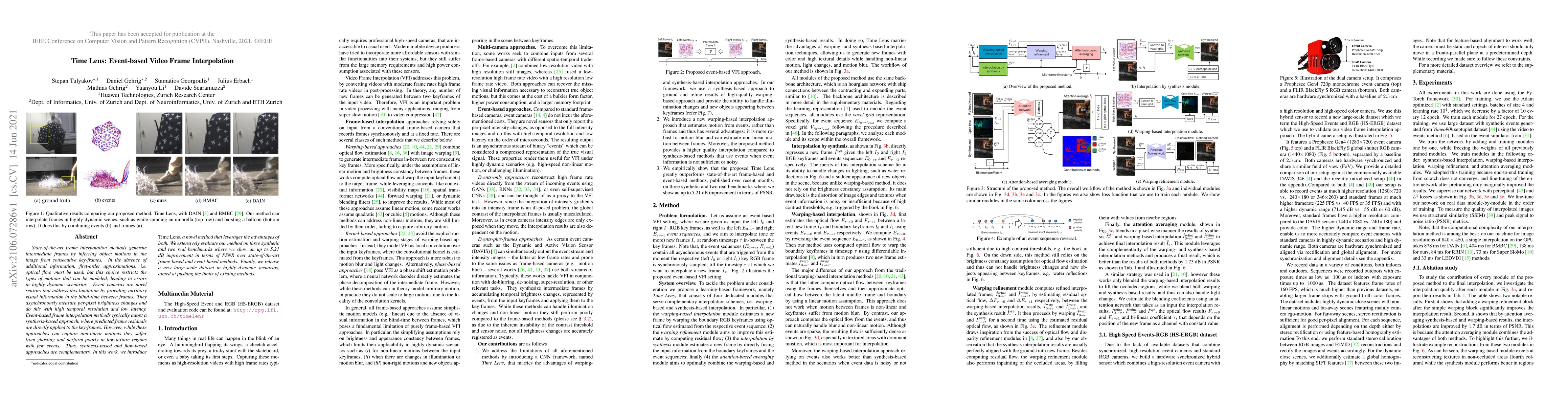 TimeLens combines synthesis-based and flow-based approaches to improve event-based video frame interpolation, achieving up to 5.21 dB better PSNR in dynamic scenarios compared to existing methods. The method leverages event cameras' high temporal resolution to model non-linear motions while mitigating ghosting and texture issues.