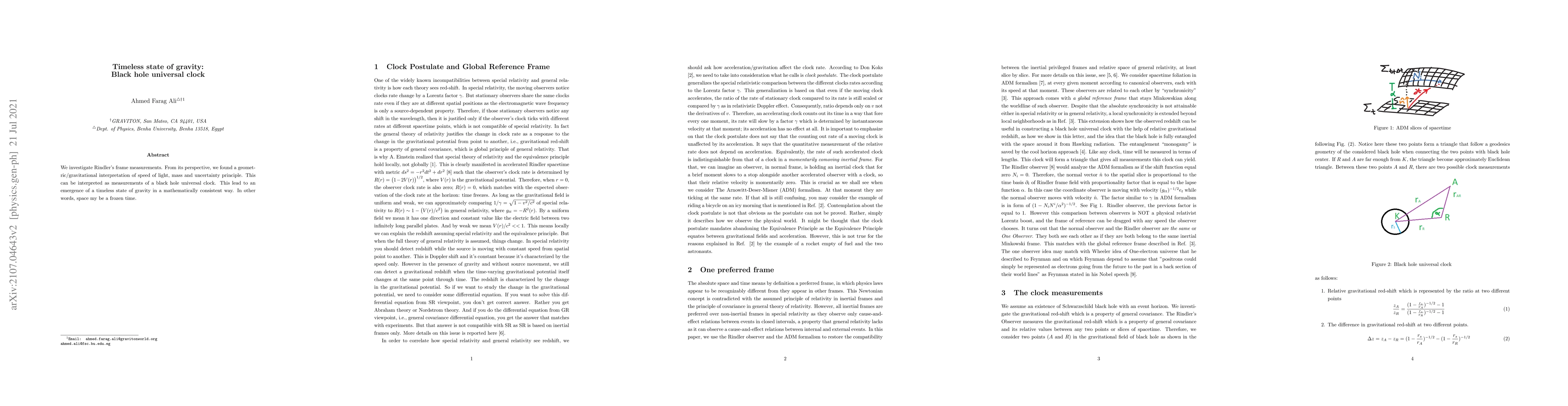 This paper explores Rindler's frame measurements to reveal a geometric/gravitational interpretation of light speed, mass, and the uncertainty principle, proposing a black hole universal clock that leads to a timeless state of gravity, suggesting space may function as a frozen time.