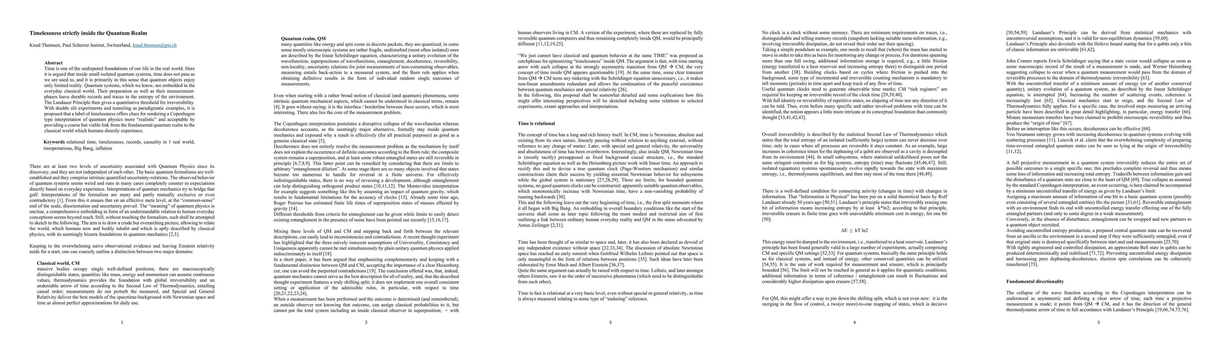 Time is one of the undisputed foundations of our life in the real world. Here it is argued that inside small isolated quantum systems, time does not pass as we are used to, and it is primarily in this sense that quantum objects enjoy only limited reality. Quantum systems, which we know, are embedded in the everyday classical world. Their preparation as well as their measurement-phases leave durable records and traces in the entropy of the environment. The Landauer Principle then gives a quantitative threshold for irreversibility. With double slit experiments and tunneling as paradigmatic examples, it is proposed that a label of timelessness offers clues for rendering a Copenhagen type interpretation of quantum physics more realistic and acceptable by providing a coarse but viable link from the fundamental quantum realm to the classical world which humans directly experience.