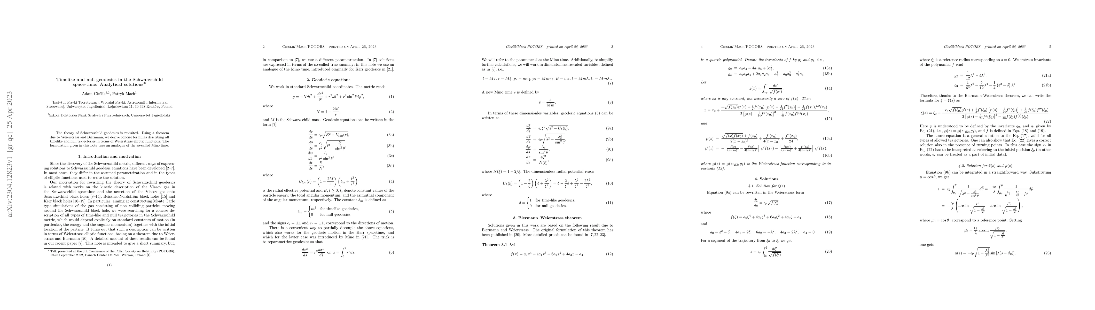 This paper derives analytical solutions for timelike and null geodesics in Schwarzschild space-time using Weierstrass elliptic functions and a theorem by Weierstrass and Biermann, introducing an analogue of Mino time for a concise formulation.