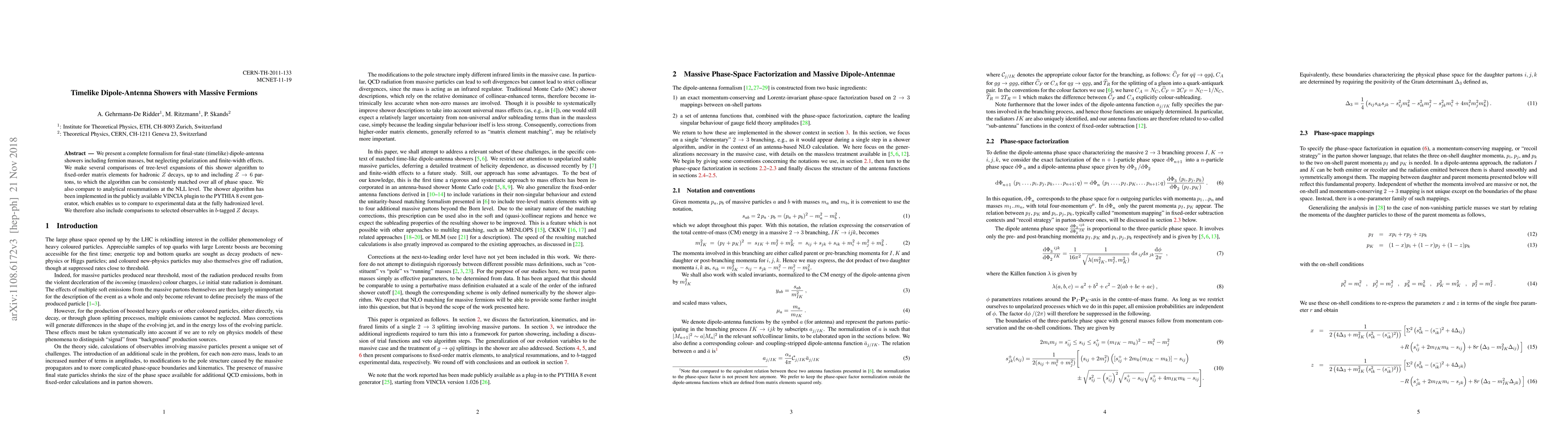 This paper introduces a comprehensive formalism for timelike dipole-antenna showers with massive fermions, comparing it to fixed-order matrix elements and NLL resummations. The algorithm, implemented in the VINCIA plugin for PYTHIA 8, allows comparison with experimental data and b-tagged Z decay observables.