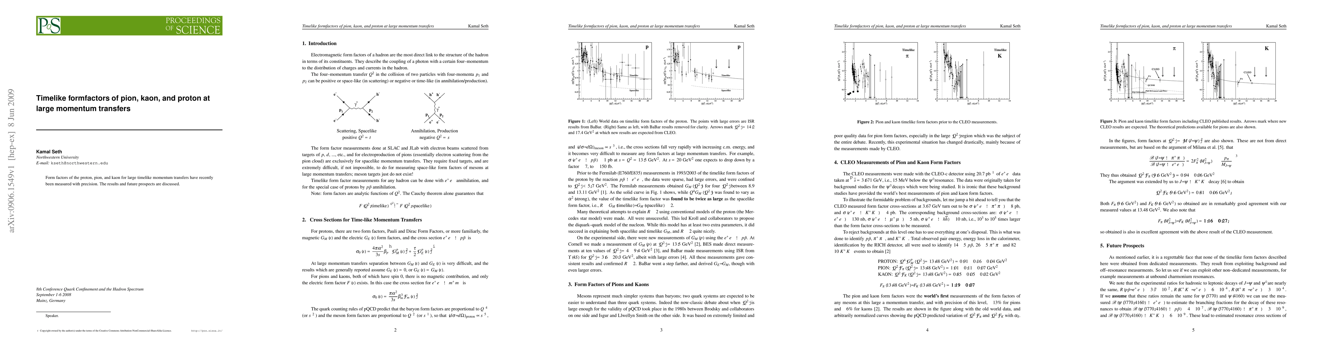 This paper presents precise measurements of the timelike form factors for the proton, pion, and kaon, focusing on large momentum transfers. It discusses the implications of these findings and outlines future research prospects in this area.