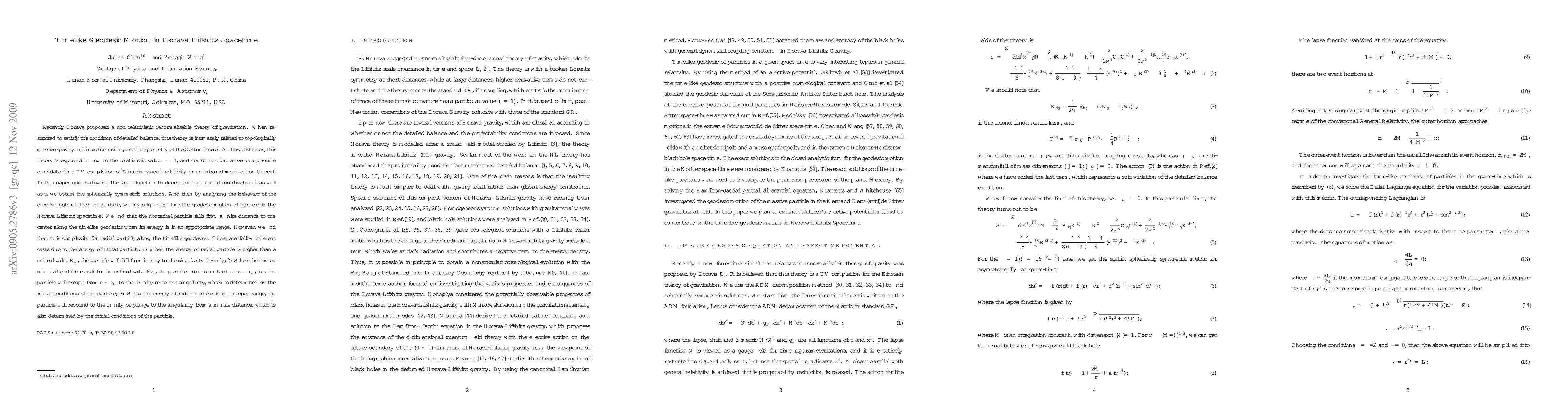 This paper investigates the timelike geodesic motion in Horava-Lifshitz spacetime, finding that nonradial particles fall to the center along geodesics when their energy is within a specific range. For radial particles, outcomes depend on their energy: high energy leads to direct fall to the singularity, equal to critical energy results in unstable orbits, and lower energy allows for rebounding or plunging based on initial conditions.