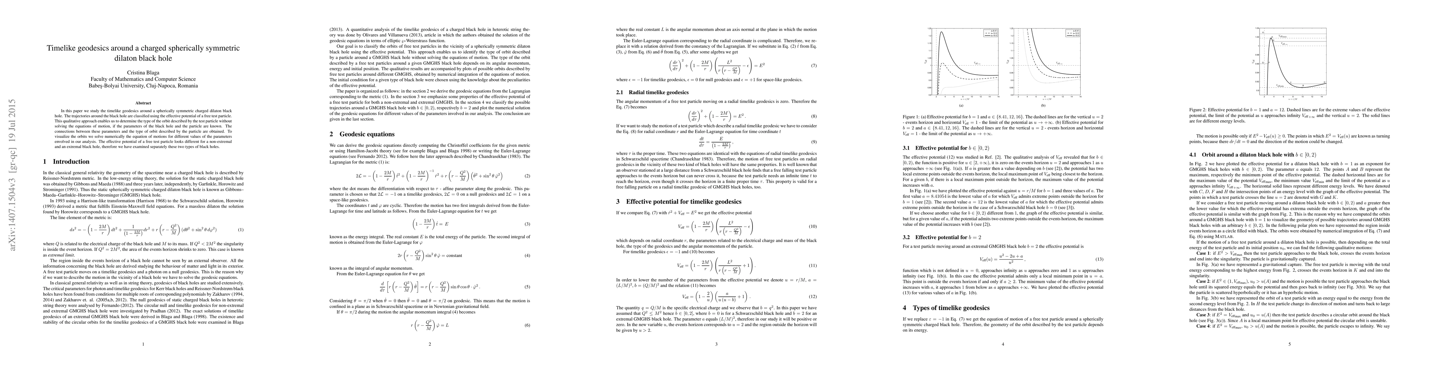 This paper investigates timelike geodesics around a charged spherically symmetric dilaton black hole, classifying the trajectories using the effective potential of a free test particle. Numerical solutions of the equations of motion reveal different effective potentials for non-extremal and extremal black holes, providing insights into the relationship between black hole parameters and the nature of the orbits.