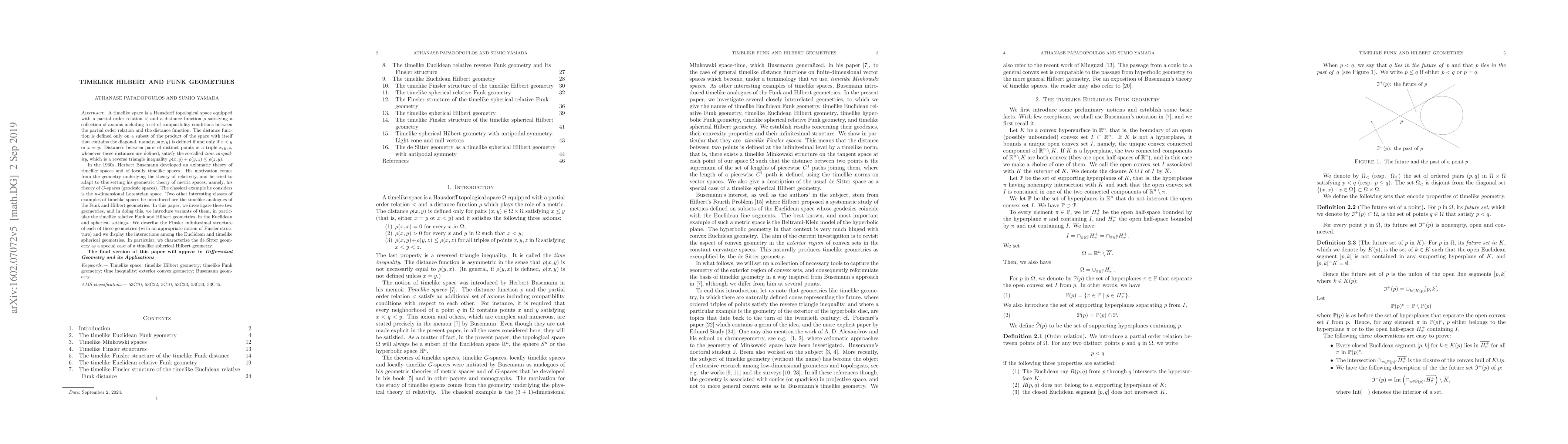 This paper explores the timelike analogues of Funk and Hilbert geometries, introducing timelike relative Funk and Hilbert geometries in Euclidean and spherical settings. The study focuses on their Finsler infinitesimal structures and interactions, highlighting the de Sitter geometry as a special case within timelike spherical Hilbert geometry.