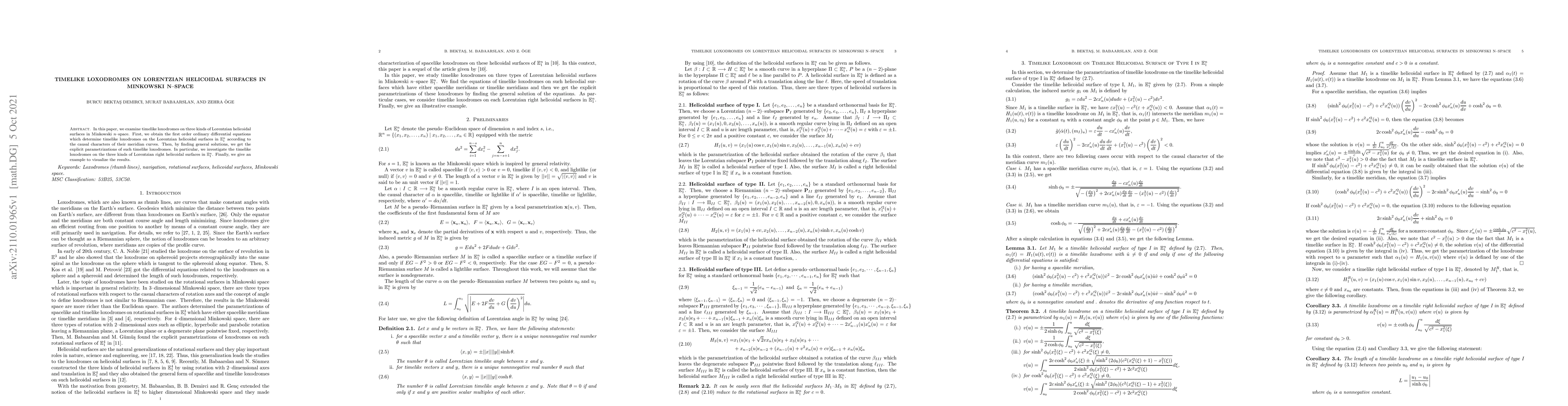 This paper investigates timelike loxodromes on three types of Lorentzian helicoidal surfaces in Minkowski n-space, deriving first-order differential equations and explicit parametrizations for these curves, and providing a visualization example.