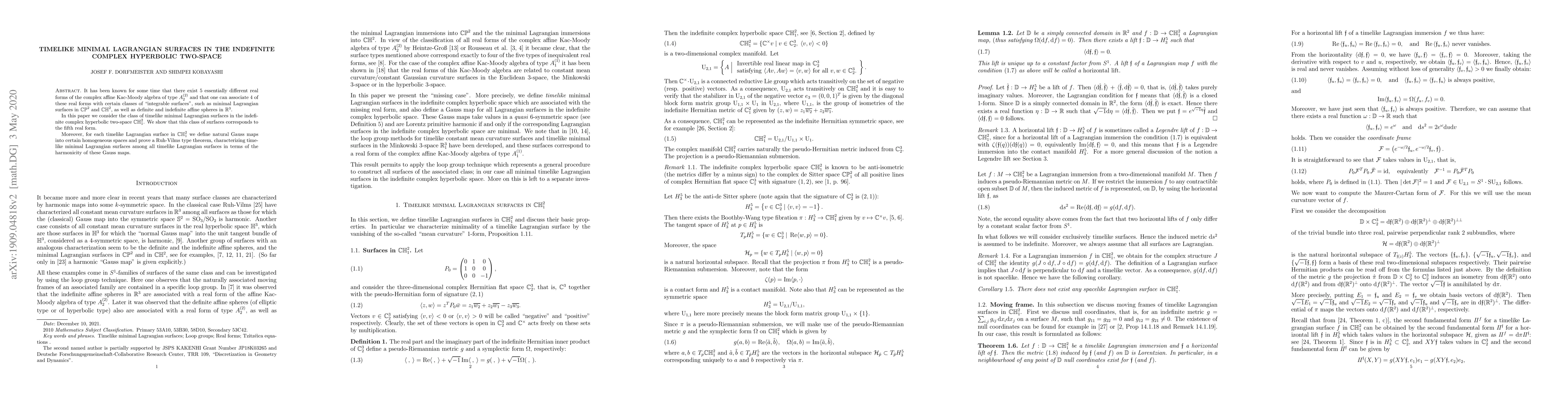 It has been known for some time that there exist $5$ essentially different real forms of the complex affine Kac-Moody algebra of type $A_2^{(2)}$ and that one can associate $4$ of these real forms with certain classes of "integrable surfaces", such as minimal Lagrangian surfaces in $\mathbb {CP}^2$ and $\mathbb {CH}^2$, as well as definite and indefinite affine spheres in $\mathbb R^3$. In this paper we consider the class of timelike minimal Lagrangian surfaces in the indefinite complex hyperbolic two-space $\mathbb{CH}^2_1$. We show that this class of surfaces corresponds to the fifth real form. Moreover, for each timelike Lagrangian surface in $\mathbb {CH}^2_1$ we define natural Gauss maps into certain homogeneous spaces and prove a Ruh-Vilms type theorem, characterizing timelike minimal Lagrangian surfaces among all timelike Lagrangian surfaces in terms of the harmonicity of these Gauss maps.