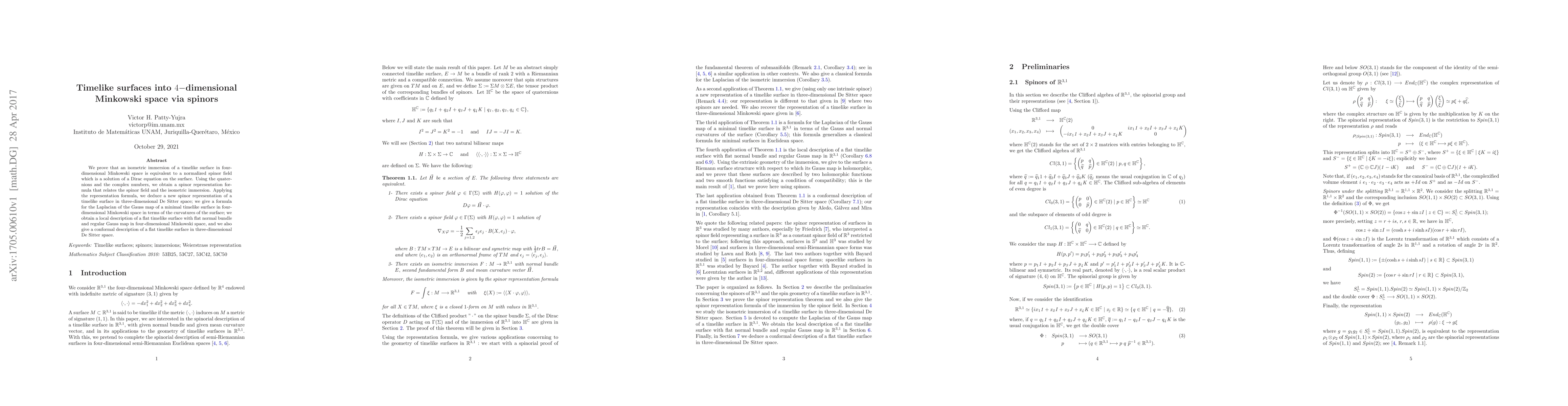 This paper establishes a connection between isometric immersions of timelike surfaces in 4-dimensional Minkowski space and normalized spinor fields solving a Dirac equation, using quaternions and complex numbers for representation. It also provides a new spinor representation for timelike surfaces in De Sitter space and derives formulas for the Laplacian of the Gauss map and local descriptions of flat timelike surfaces.