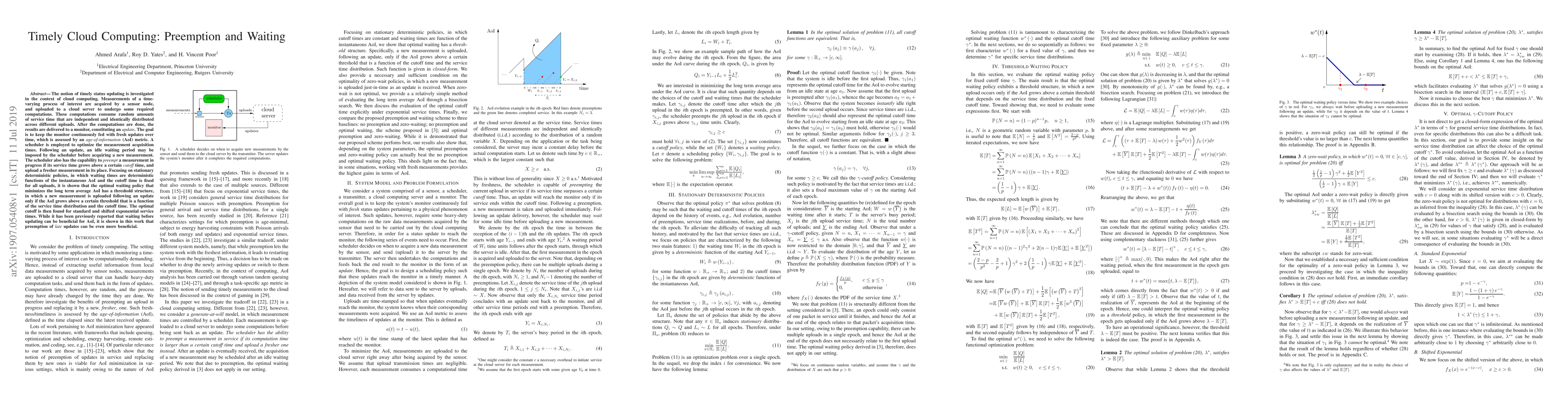 The notion of timely status updating is investigated in the context of cloud computing. Measurements of a time-varying process of interest are acquired by a sensor node, and uploaded to a cloud server to undergo some required computations. These computations consume random amounts of service time that are independent and identically distributed across different uploads. After the computations are done, the results are delivered to a monitor, constituting an update. The goal is to keep the monitor continuously fed with fresh updates over time, which is assessed by an age-of-information (AoI) metric. A scheduler is employed to optimize the measurement acquisition times. Following an update, an idle waiting period may be imposed by the scheduler before acquiring a new measurement. The scheduler also has the capability to preempt a measurement in progress if its service time grows above a certain cutoff time, and upload a fresher measurement in its place. Focusing on stationary deterministic policies, in which waiting times are deterministic functions of the instantaneous AoI and the cutoff time is fixed for all uploads, it is shown that the optimal waiting policy that minimizes the long term average AoI has a threshold structure, in which a new measurement is uploaded following an update only if the AoI grows above a certain threshold that is a function of the service time distribution and the cutoff time. The optimal cutoff is then found for standard and shifted exponential service times. While it has been previously reported that waiting before updating can be beneficial for AoI, it is shown in this work that preemption of late updates can be even more beneficial.