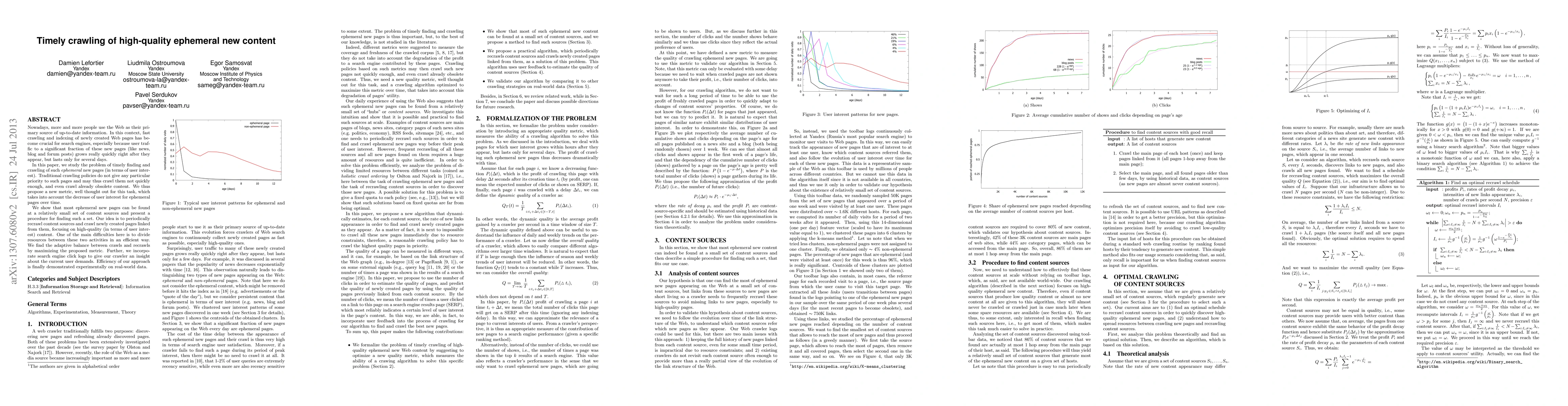 This paper proposes a new metric to prioritize the timely crawling of ephemeral new web pages that experience rapid spikes in user interest. It introduces a method to efficiently balance between discovering new content and recrawling existing sources, using search engine click logs to adapt to current user demands, and demonstrates its effectiveness through experiments.