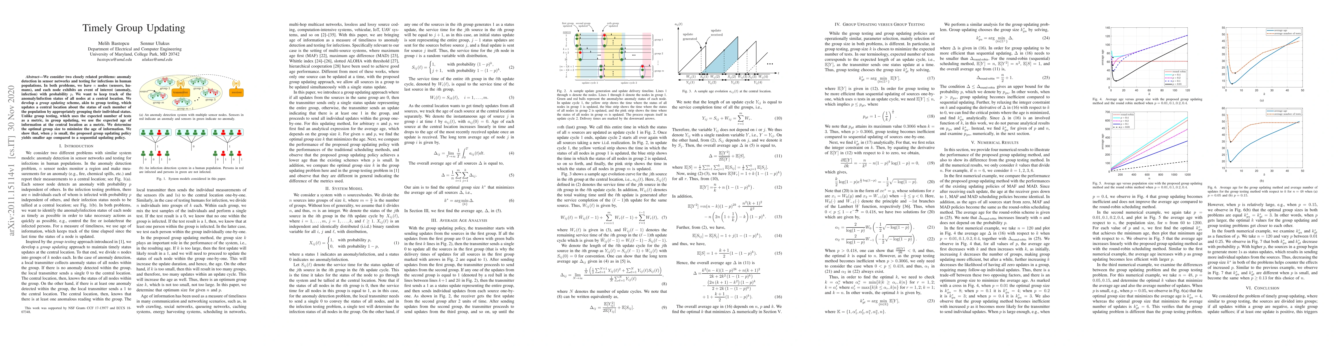We consider two closely related problems: anomaly detection in sensor networks and testing for infections in human populations. In both problems, we have $n$ nodes (sensors, humans), and each node exhibits an event of interest (anomaly, infection) with probability $p$. We want to keep track of the anomaly/infection status of all nodes at a central location. We develop a $group$ $updating$ scheme, akin to group testing, which updates a central location about the status of each member of the population by appropriately grouping their individual status. Unlike group testing, which uses the expected number of tests as a metric, in group updating, we use the expected age of information at the central location as a metric. We determine the optimal group size to minimize the age of information. We show that, when $p$ is small, the proposed group updating policy yields smaller age compared to a sequential updating policy.