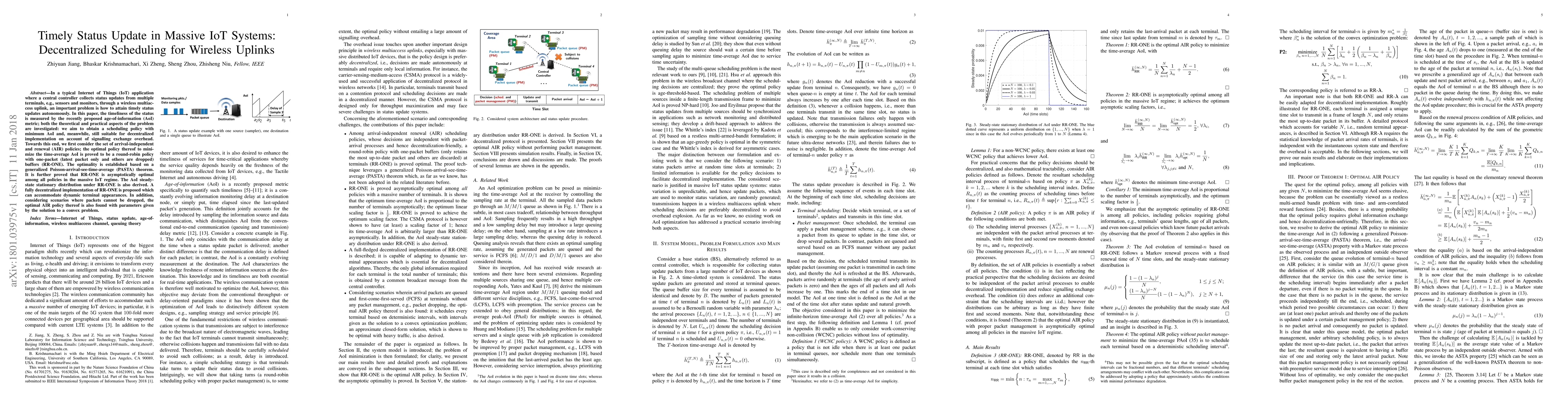 In a typical Internet of Things (IoT) application where a central controller collects status updates from multiple terminals, e.g., sensors and monitors, through a wireless multiaccess uplink, an important problem is how to attain timely status updates autonomously. In this paper, the timeliness of the status is measured by the recently proposed age-of-information (AoI) metric; both the theoretical and practical aspects of the problem are investigated: we aim to obtain a scheduling policy with minimum AoI and, meanwhile, still suitable for decentralized implementation on account of signalling exchange overhead. Towards this end, we first consider the set of arrival-independent and renewal (AIR) policies; the optimal policy thereof to minimize the time-average AoI is proved to be a round-robin policy with one-packet (latest packet only and others are dropped) buffers (RR-ONE). The optimality is established based on a generalized Poisson-arrival-see-time-average (PASTA) theorem. It is further proved that RR-ONE is asymptotically optimal among all policies in the massive IoT regime. The AoI steady-state stationary distribution under RR-ONE is also derived. A fully decentralized implementation of RR-ONE is proposed which can accommodate dynamic terminal appearances. In addition, considering scenarios where packets cannot be dropped, the optimal AIR policy thereof is also found with parameters given by the solution to a convex problem.