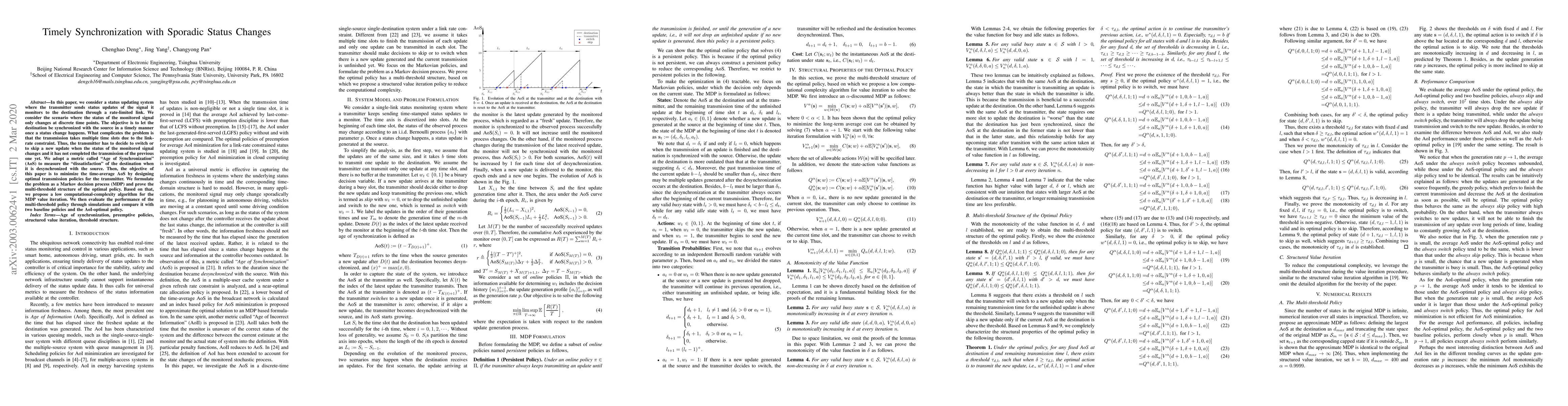 In this paper, we consider a status updating system where the transmitter sends status updates of the signal it monitors to the destination through a rate-limited link. We consider the scenario where the status of the monitored signal only changes at discrete time points. The objective is to let the destination be synchronized with the source in a timely manner once a status change happens. What complicates the problem is that the transmission takes multiple time slots due to the link-rate constraint. Thus, the transmitter has to decide to switch or to skip a new update when the status of the monitored signal changes and it has not completed the transmission of the previous one yet. We adopt a metric called "Age of Synchronization" (AoS) to measure the "dissatisfaction" of the destination when it is desynchronized with the source. Then, the objective of this paper is to minimize the time-average AoS by designing optimal transmission policies for the transmitter. We formulate the problem as a Markov decision process (MDP) and prove the multi-threshold structure of the optimal policy. Based on that, we propose a low computational-complexity algorithm for the MDP value iteration. We then evaluate the performance of the multi-threshold policy through simulations and compare it with two baseline policies and the AoI-optimal policy.