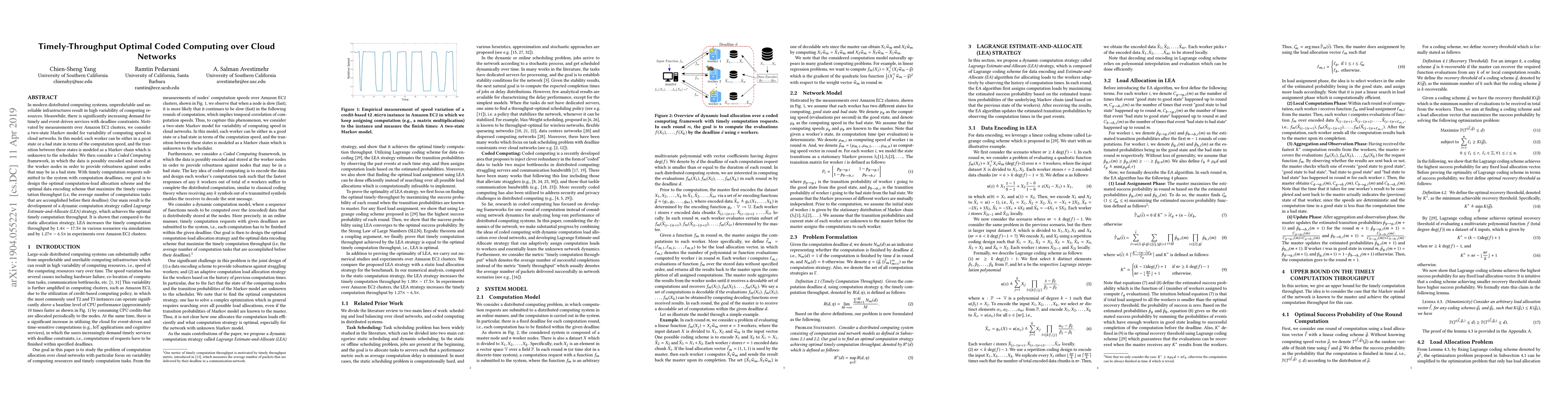 In modern distributed computing systems, unpredictable and unreliable infrastructures result in high variability of computing resources. Meanwhile, there is significantly increasing demand for timely and event-driven services with deadline constraints. Motivated by measurements over Amazon EC2 clusters, we consider a two-state Markov model for variability of computing speed in cloud networks. In this model, each worker can be either in a good state or a bad state in terms of the computation speed, and the transition between these states is modeled as a Markov chain which is unknown to the scheduler. We then consider a Coded Computing framework, in which the data is possibly encoded and stored at the worker nodes in order to provide robustness against nodes that may be in a bad state. With timely computation requests submitted to the system with computation deadlines, our goal is to design the optimal computation-load allocation scheme and the optimal data encoding scheme that maximize the timely computation throughput (i.e, the average number of computation tasks that are accomplished before their deadline). Our main result is the development of a dynamic computation strategy called Lagrange Estimate-and Allocate (LEA) strategy, which achieves the optimal timely computation throughput. It is shown that compared to the static allocation strategy, LEA increases the timely computation throughput by 1.4X - 17.5X in various scenarios via simulations and by 1.27X - 6.5X in experiments over Amazon EC2 clusters