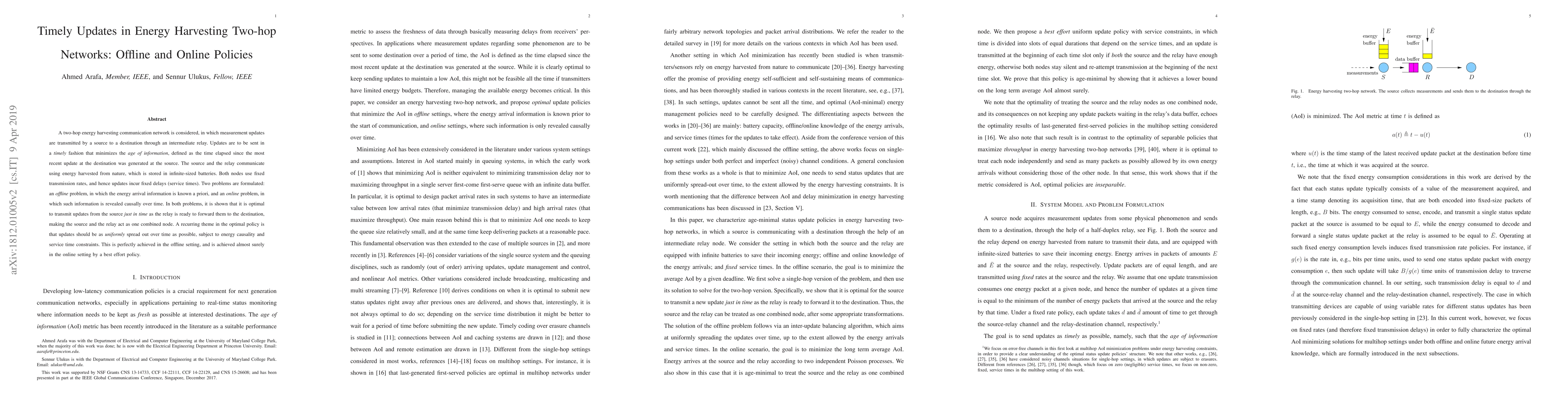 This paper explores two-hop energy harvesting networks where timely updates minimize information age. It compares offline and online policies for optimal transmission timing, showing that updates should be uniformly spread out to maximize efficiency, with near-optimal results achieved in both scenarios.