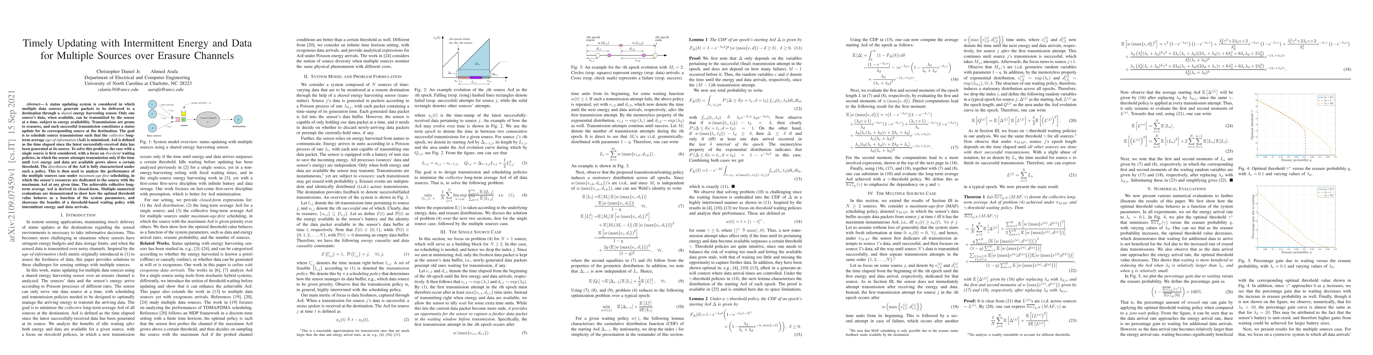 A status updating system is considered in which multiple data sources generate packets to be delivered to a destination through a shared energy harvesting sensor. Only one source's data, when available, can be transmitted by the sensor at a time, subject to energy availability. Transmissions are prune to erasures, and each successful transmission constitutes a status update for its corresponding source at the destination. The goal is to schedule source transmissions such that the collective long-term average age-of-information (AoI) is minimized. AoI is defined as the time elapsed since the latest successfully-received data has been generated at its source. To solve this problem, the case with a single source is first considered, with a focus on threshold waiting policies, in which the sensor attempts transmission only if the time until both energy and data are available grows above a certain threshold. The distribution of the AoI is fully characterized under such a policy. This is then used to analyze the performance of the multiple sources case under maximum-age-first scheduling, in which the sensor's resources are dedicated to the source with the maximum AoI at any given time. The achievable collective long-term average AoI is derived in closed-form. Multiple numerical evaluations are demonstrated to show how the optimal threshold value behaves as a function of the system parameters, and showcase the benefits of a threshold-based waiting policy with intermittent energy and data arrivals.