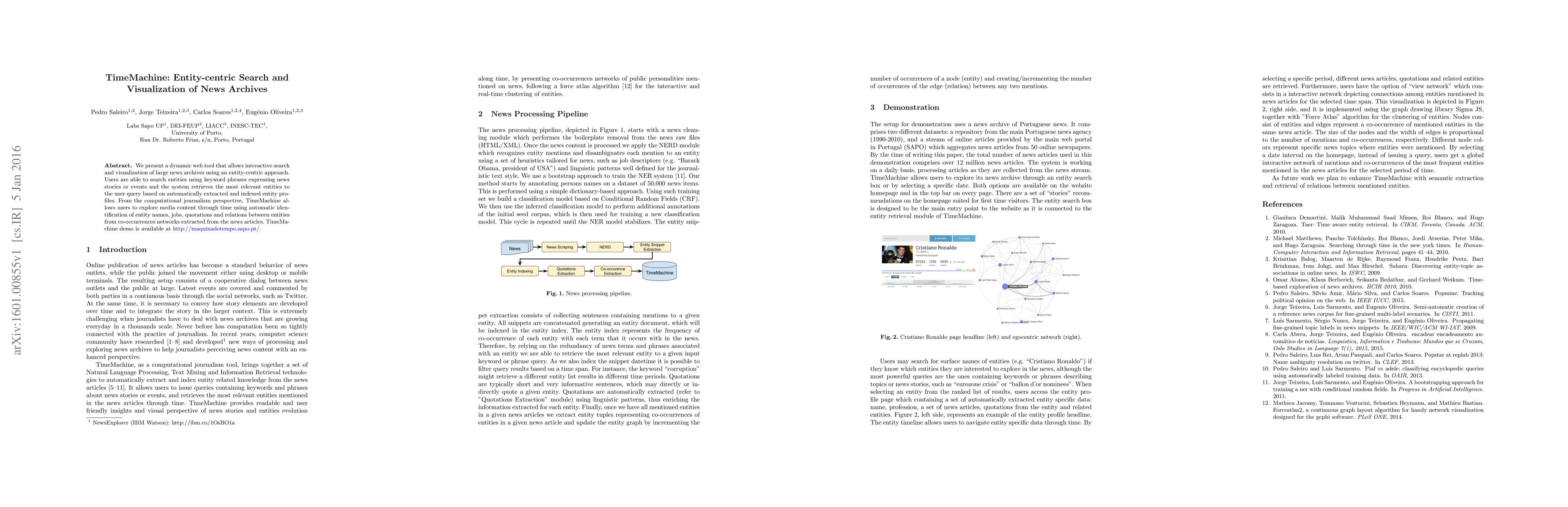 Title: TimeMachine: Entity-centric Search and Visualization of News Archives Summary: TimeMachine is a web tool for interactive search and visualization of news archives, focusing on entities through keyword queries, enabling exploration of media content over time via automatic identification of entities and their relationships.