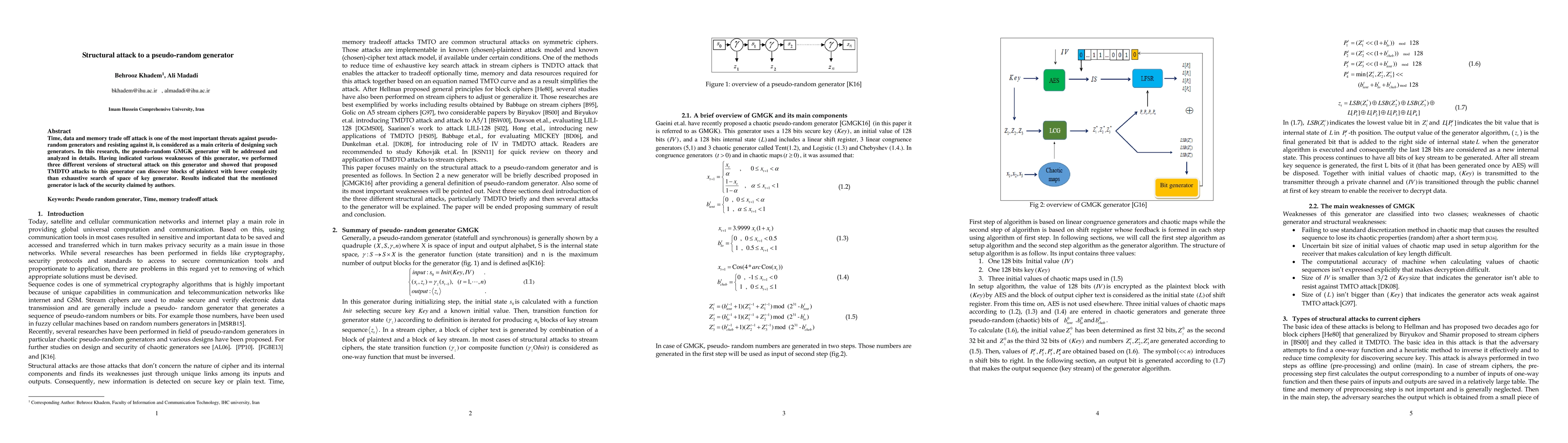 Time, data and memory trade off attack is one of the most important threats against pseudo- random generators and resisting against it, is considered as a main criteria of designing such generators. In this research, the pseudo-random GMGK generator will be addressed and analyzed in details. Having indicated various weaknesses of this generator, we performed three different versions of structural attack on this generator and showed that proposed TMDTO attacks to this generator can discover blocks of plaintext with lower complexity than exhaustive search of space of key generator. Results indicated that the mentioned generator is lack of the security claimed by authors.