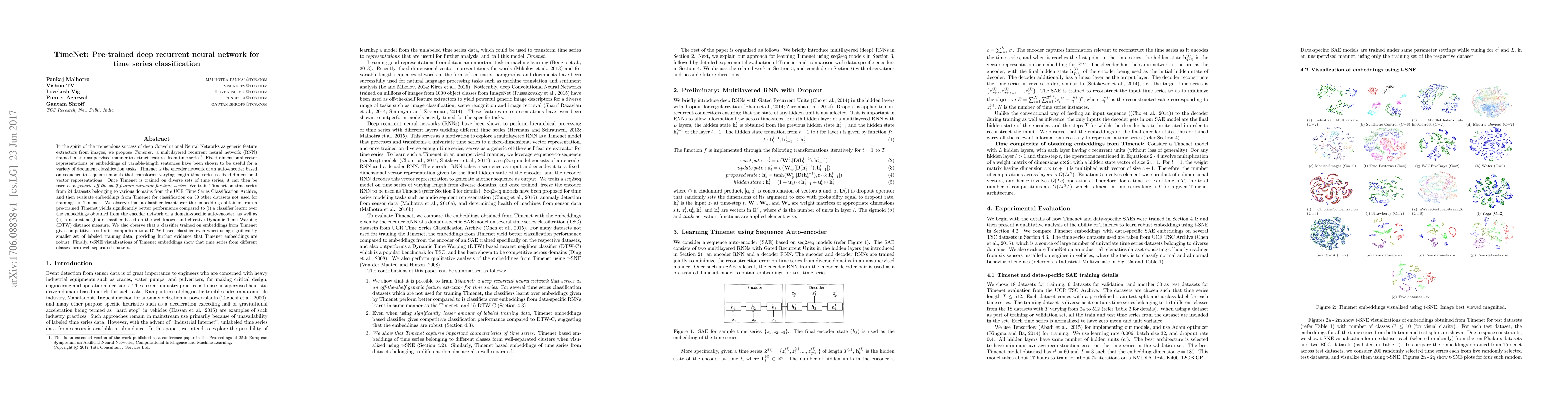 TimeNet is a pre-trained deep recurrent neural network for time series classification, utilizing an unsupervised approach to generalize time series representations across domains. The trained model provides superior embeddings for classification tasks compared to domain-specific RNNs and traditional methods like Dynamic Time Warping.