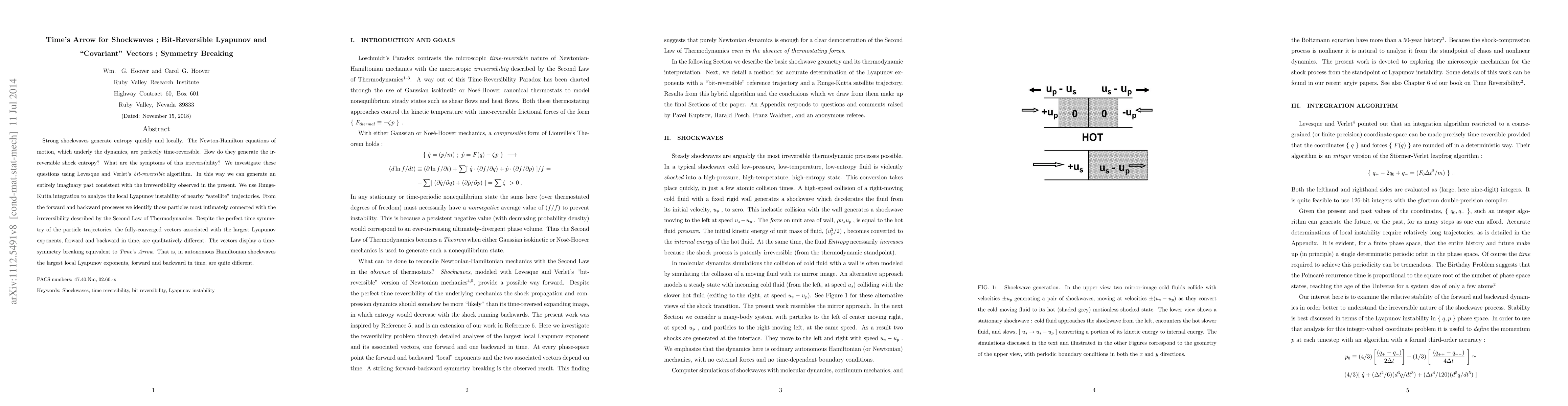 This paper explores how time-reversible Newton-Hamilton equations generate irreversible shock entropy, using bit-reversible algorithms and Runge-Kutta integration to reveal the local Lyapunov instability. It finds that despite time symmetry, the largest Lyapunov vectors forward and backward in time differ, indicating a symmetry breaking akin to Time's Arrow.