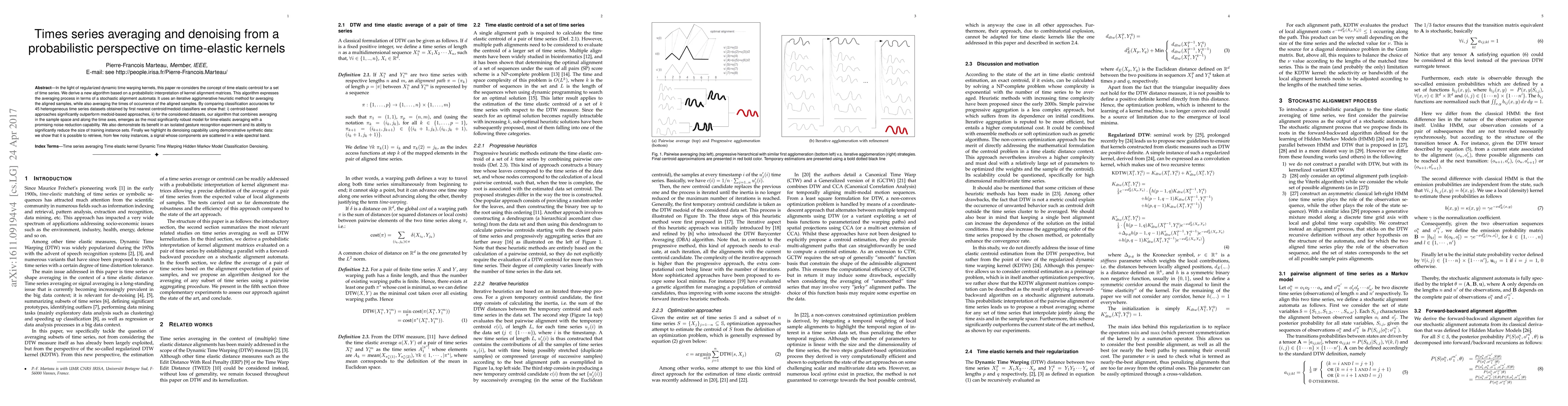 In the light of regularized dynamic time warping kernels, this paper re-considers the concept of time elastic centroid for a setof time series. We derive a new algorithm based on a probabilistic interpretation of kernel alignment matrices. This algorithm expressesthe averaging process in terms of a stochastic alignment automata. It uses an iterative agglomerative heuristic method for averagingthe aligned samples, while also averaging the times of occurrence of the aligned samples. By comparing classification accuracies for45 heterogeneous time series datasets obtained by first nearest centroid/medoid classifiers we show that: i) centroid-basedapproaches significantly outperform medoid-based approaches, ii) for the considered datasets, our algorithm that combines averagingin the sample space and along the time axes, emerges as the most significantly robust model for time-elastic averaging with apromising noise reduction capability. We also demonstrate its benefit in an isolated gesture recognition experiment and its ability tosignificantly reduce the size of training instance sets. Finally we highlight its denoising capability using demonstrative synthetic data:we show that it is possible to retrieve, from few noisy instances, a signal whose components are scattered in a wide spectral band.