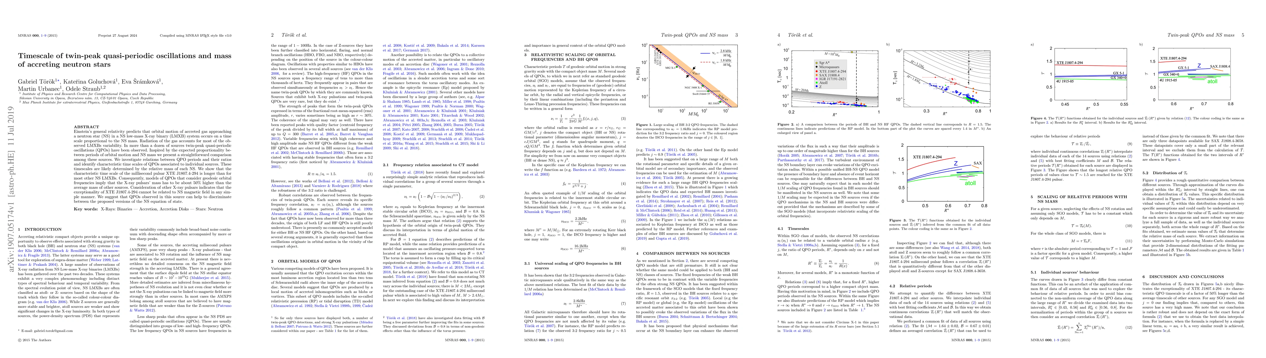 This research examines the relationship between twin-peak quasi-periodic oscillations (QPOs) in low-mass X-ray binary systems and the masses of accreting neutron stars. It identifies characteristic time scales of QPOs linked to individual neutron stars, suggesting that these time scales may determine the neutron star mass. The study highlights that the X-ray pulsar XTE J1807.4-294 has a longer characteristic QPO time scale, implying its mass is about 50% higher than other neutron stars. The findings suggest that QPOs in XTE J1807.4-294 could aid in distinguishing between proposed neutron star equation of state models.