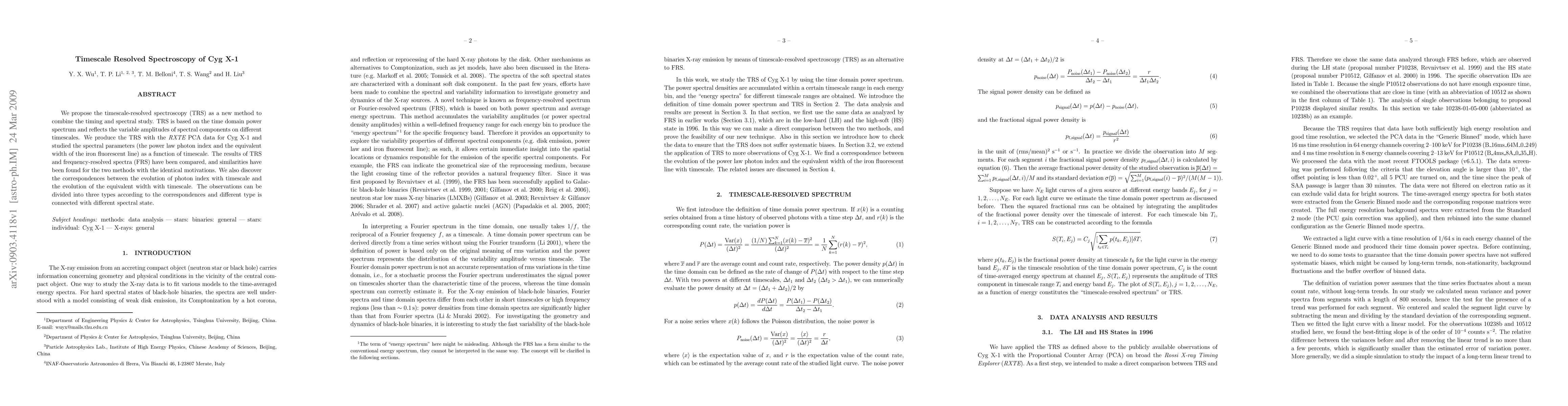 This paper introduces timescale-resolved spectroscopy (TRS) as a novel method combining timing and spectral analysis, applied to Cyg X-1 using RXTE PCA data. TRS reveals relationships between spectral parameters and timescales, showing similarities with frequency-resolved spectra and correlating spectral state transitions with variations in photon index and iron fluorescent line width.