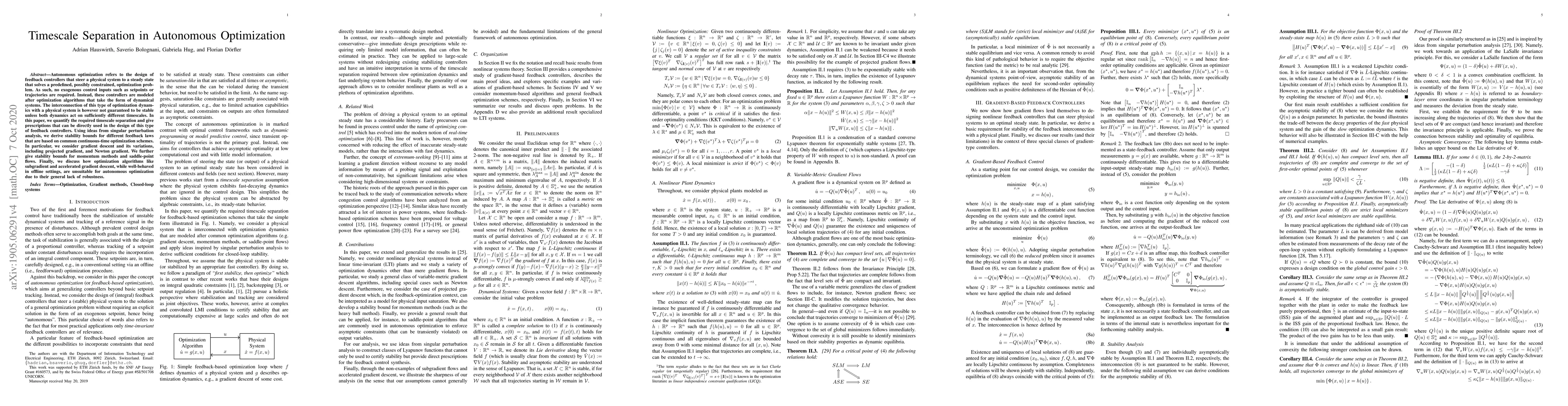 Autonomous optimization refers to the design of feedback controllers that steer a physical system to a steady state that solves a predefined, possibly constrained, optimization problem. As such, no exogenous control inputs such as setpoints or trajectories are required. Instead, these controllers are modeled after optimization algorithms that take the form of dynamical systems. The interconnection of this type of optimization dynamics with a physical system is however not guaranteed to be stable unless both dynamics act on sufficiently different timescales. In this paper, we quantify the required timescale separation and give prescriptions that can be directly used in the design of this type of feedback controllers. Using ideas from singular perturbation analysis, we derive stability bounds for different feedback laws that are based on common continuous-time optimization schemes. In particular, we consider gradient descent and its variations, including projected gradient, and Newton gradient. We further give stability bounds for momentum methods and saddle-point flows. Finally, we discuss how optimization algorithms like subgradient and accelerated gradient descent, while well-behaved in offline settings, are unsuitable for autonomous optimization due to their general lack of robustness.