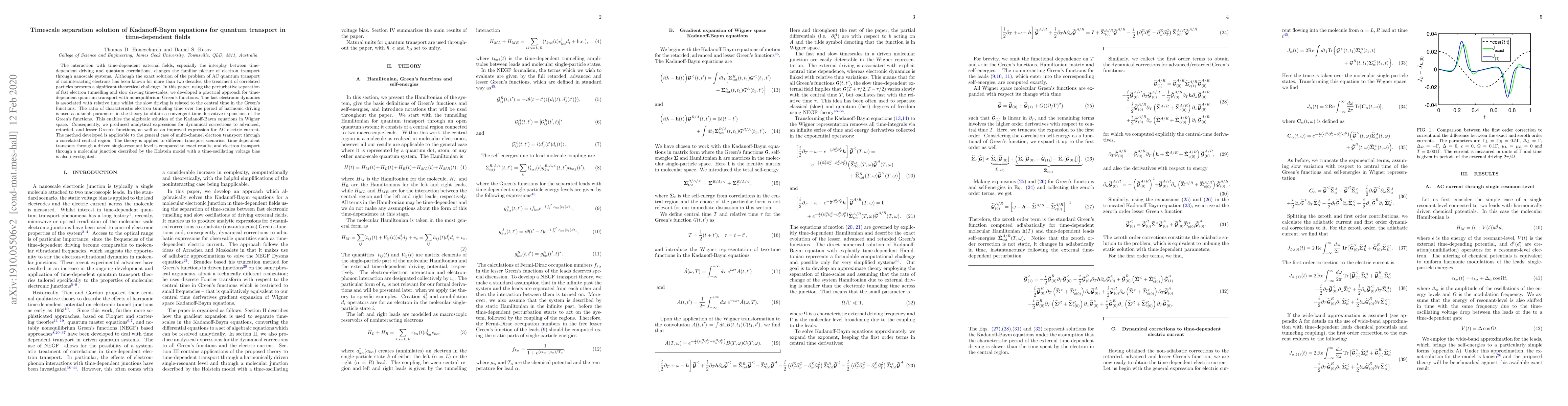 This paper develops a perturbative method for solving Kadanoff-Baym equations to analyze quantum transport in time-dependent fields, using a timescale separation approach. Analytical expressions for Green's functions and AC electric current are derived, applicable to multi-channel transport scenarios, and validated against exact results and the Holstein model.