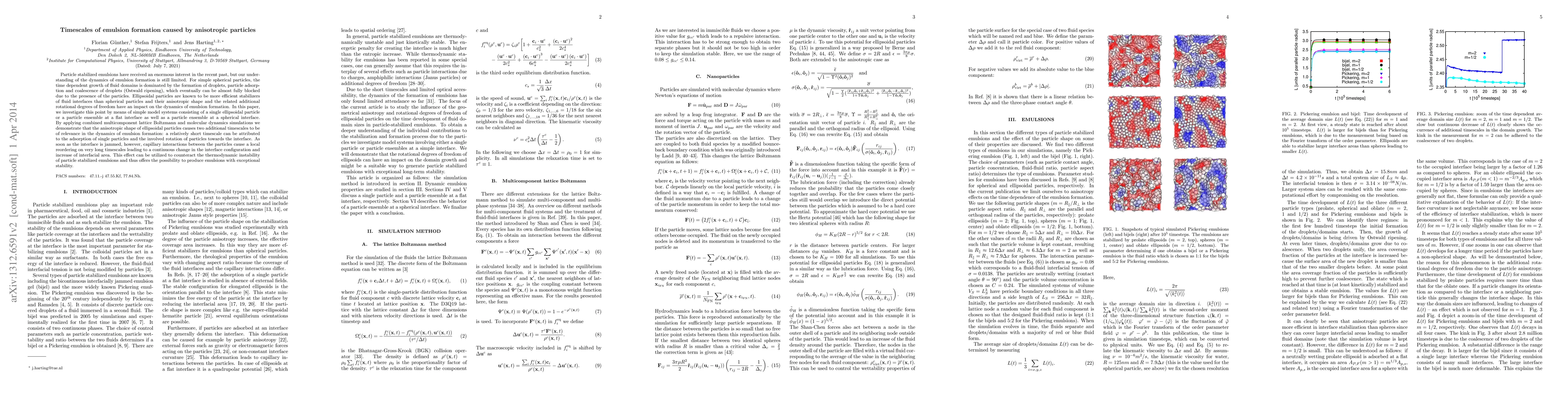 Particle stabilized emulsions have received an enormous interest in the recent past, but our understanding of the dynamics of emulsion formation is still limited. For simple spherical particles, the time dependent growth of fluid domains is dominated by the formation of droplets, particle adsorption and coalescence of droplets (Ostwald ripening), which eventually can be almost fully blocked due to the presence of the particles. Ellipsoidal particles are known to be more efficient stabilizers of fluid interfaces than spherical particles and their anisotropic shape and the related additional rotational degrees of freedom have an impact on the dynamics of emulsion formation. In this paper, we investigate this point by means of simple model systems consisting of a single ellipsoidal particle or a particle ensemble at a flat interface as well as a particle ensemble at a spherical interface. By applying combined multicomponent lattice Boltzmann and molecular dynamics simulations we demonstrate that the anisotropic shape of ellipsoidal particles causes two additional timescales to be of relevance in the dynamics of emulsion formation: a relatively short timescale can be attributed to the adsorption of single particles and the involved rotation of particles towards the interface. As soon as the interface is jammed, however, capillary interactions between the particles cause a local reordering on very long timescales leading to a continuous change in the interface configuration and increase of interfacial area. This effect can be utilized to counteract the thermodynamic instability of particle stabilized emulsions and thus offers the possibility to produce emulsions with exceptional stability.