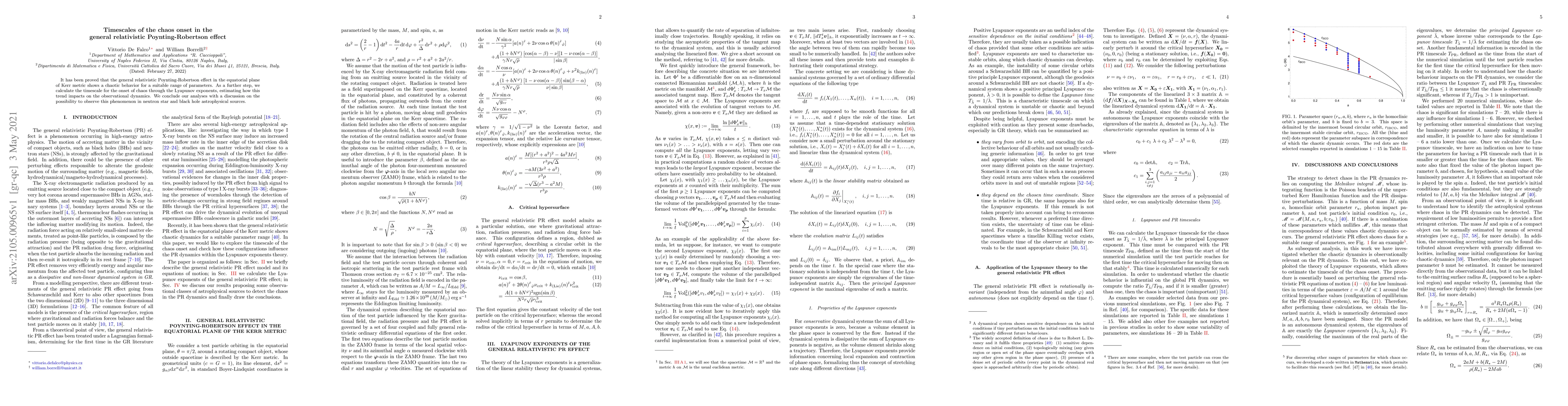 It has been proved that the general relativistic Poynting-Robertson effect in the equatorial plane of Kerr metric shows a chaotic behavior for a suitable range of parameters. As a further step, we calculate the timescale for the onset of chaos through the Lyapunov exponents, estimating how this trend impacts on the observational dynamics. We conclude our analyses with a discussion on the possibility to observe this phenomenon in neutron star and black hole astrophysical sources.