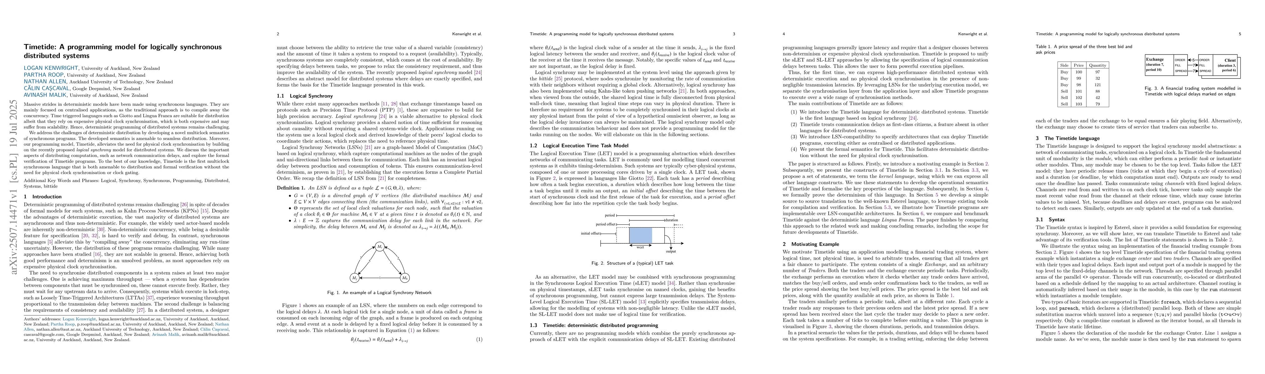 Massive strides in deterministic models have been made using synchronous languages. They are mainly focused on centralised applications, as the traditional approach is to compile away the concurrency. Time triggered languages such as Giotto and Lingua Franca are suitable for distribution albeit that they rely on expensive physical clock synchronisation, which is both expensive and may suffer from scalability. Hence, deterministic programming of distributed systems remains challenging. We address the challenges of deterministic distribution by developing a novel multiclock semantics of synchronous programs. The developed semantics is amenable to seamless distribution. Moreover, our programming model, Timetide, alleviates the need for physical clock synchronisation by building on the recently proposed logical synchrony model for distributed systems. We discuss the important aspects of distributing computation, such as network communication delays, and explore the formal verification of Timetide programs. To the best of our knowledge, Timetide is the first multiclock synchronous language that is both amenable to distribution and formal verification without the need for physical clock synchronisation or clock gating.