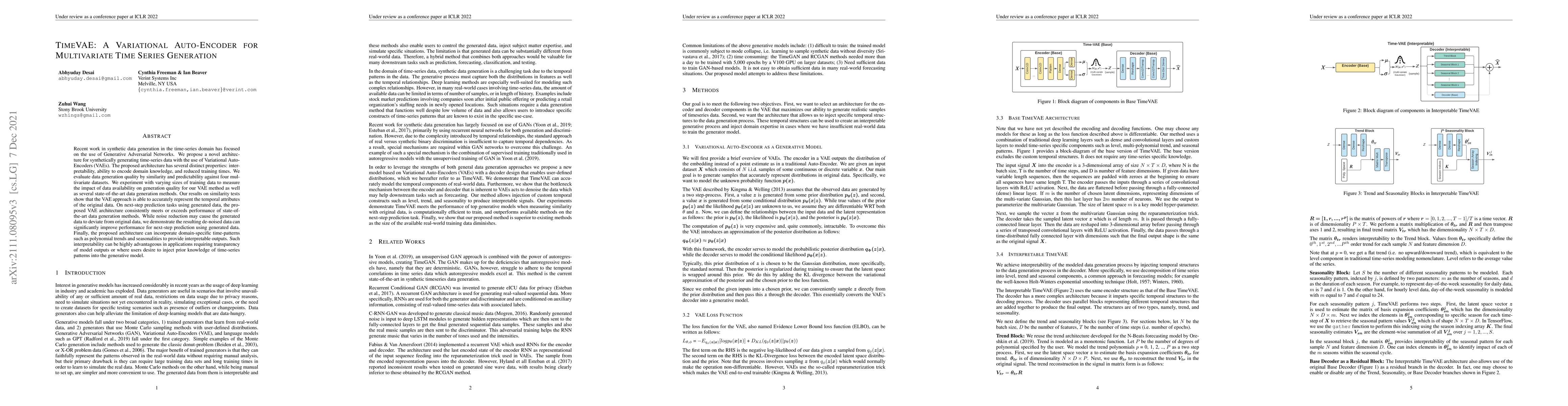 Recent work in synthetic data generation in the time-series domain has focused on the use of Generative Adversarial Networks. We propose a novel architecture for synthetically generating time-series data with the use of Variational Auto-Encoders (VAEs). The proposed architecture has several distinct properties: interpretability, ability to encode domain knowledge, and reduced training times. We evaluate data generation quality by similarity and predictability against four multivariate datasets. We experiment with varying sizes of training data to measure the impact of data availability on generation quality for our VAE method as well as several state-of-the-art data generation methods. Our results on similarity tests show that the VAE approach is able to accurately represent the temporal attributes of the original data. On next-step prediction tasks using generated data, the proposed VAE architecture consistently meets or exceeds performance of state-of-the-art data generation methods. While noise reduction may cause the generated data to deviate from original data, we demonstrate the resulting de-noised data can significantly improve performance for next-step prediction using generated data. Finally, the proposed architecture can incorporate domain-specific time-patterns such as polynomial trends and seasonalities to provide interpretable outputs. Such interpretability can be highly advantageous in applications requiring transparency of model outputs or where users desire to inject prior knowledge of time-series patterns into the generative model.