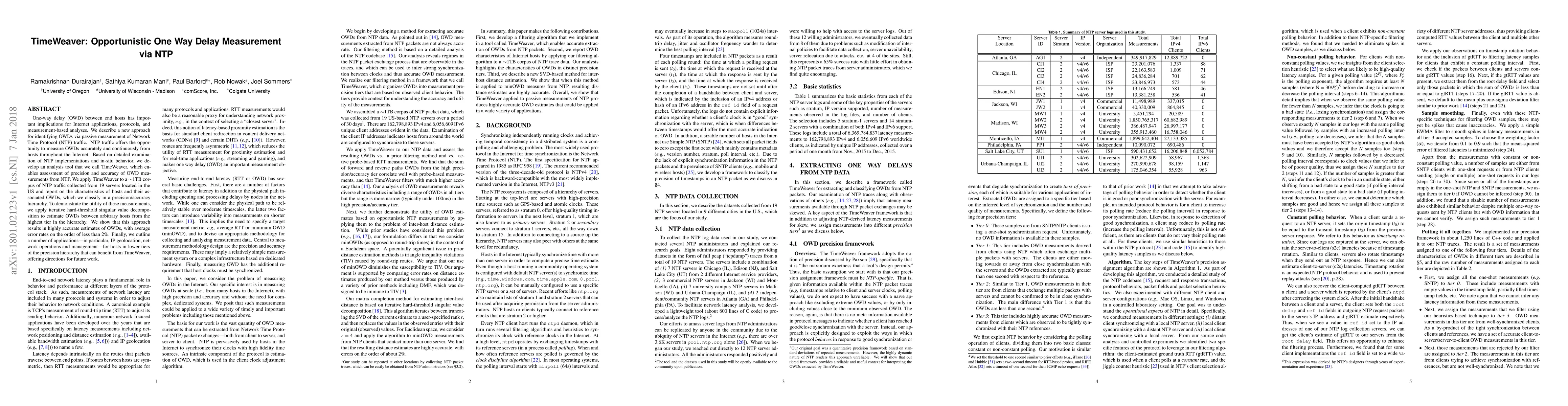 One-way delay (OWD) between end hosts has important implications for Internet applications, protocols, and measurement-based analyses. We describe a new approach for identifying OWDs via passive measurement of Network Time Protocol (NTP) traffic. NTP traffic offers the opportunity to measure OWDs accurately and continuously from hosts throughout the Internet. Based on detailed examina- tion of NTP implementations and in-situ behavior, we develop an analysis tool that we call TimeWeaver, which enables assessment of precision and accuracy of OWD measurements from NTP. We apply TimeWeaver to a ~1TB corpus of NTP traffic collected from 19 servers located in the US and report on the characteristics of hosts and their associated OWDs, which we classify in a precision/accuracy hierarchy. To demonstrate the utility of these measurements, we apply iterative hard-threshold singular value decomposition to estimate OWDs between arbitrary hosts from the high- est tier in the hierarchy. We show that this approach results in highly accurate estimates of OWDs, with average error rates on the order of less than 2%. Finally, we outline a number of applications---in particular, IP geolocation, network operations and management---for hosts in lower tiers of the precision hierarchy that can benefit from TimeWeaver, offering directions for future work.