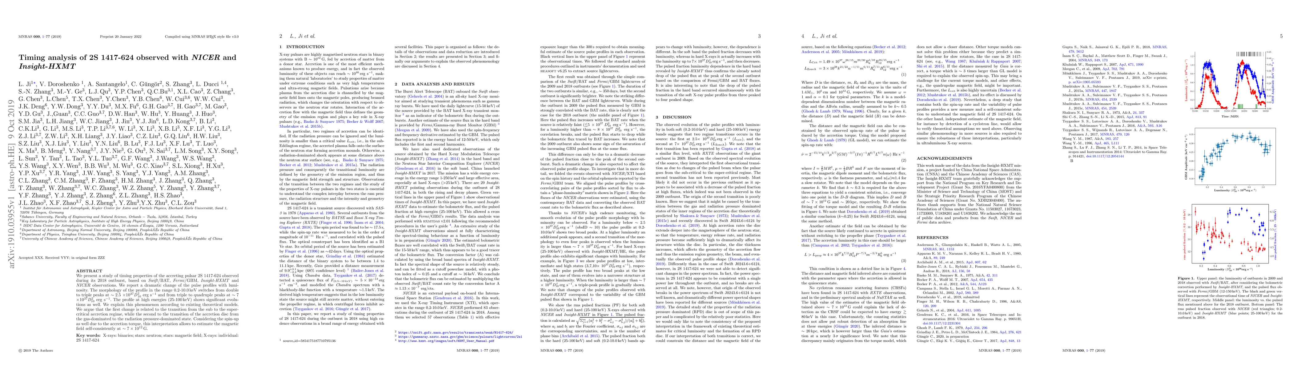 We present a study of timing properties of the accreting pulsar 2S 1417-624 observed during its 2018 outburst, based on Swift/BAT, Fermi/GBM, Insight-HXMT and NICER observations. We report a dramatic change of the pulse profiles with luminosity. The morphology of the profile in the range 0.2-10.0keV switches from double to triple peaks at $\sim2.5$ $\rm \times 10^{37}{\it D}_{10}^2\ erg\ s^{-1}$ and from triple to quadruple peaks at $\sim7$ $\rm \times 10^{37}{\it D}_{10}^2\ erg\ s^{-1}$. The profile at high energies (25-100keV) shows significant evolutions as well. We explain this phenomenon according to existing theoretical models. We argue that the first change is related to the transition from the sub to the super-critical accretion regime, while the second to the transition of the accretion disc from the gas-dominated to the radiation pressure-dominated state. Considering the spin-up as well due to the accretion torque, this interpretation allows to estimate the magnetic field self-consistently at $\sim7\times 10^{12}$G.