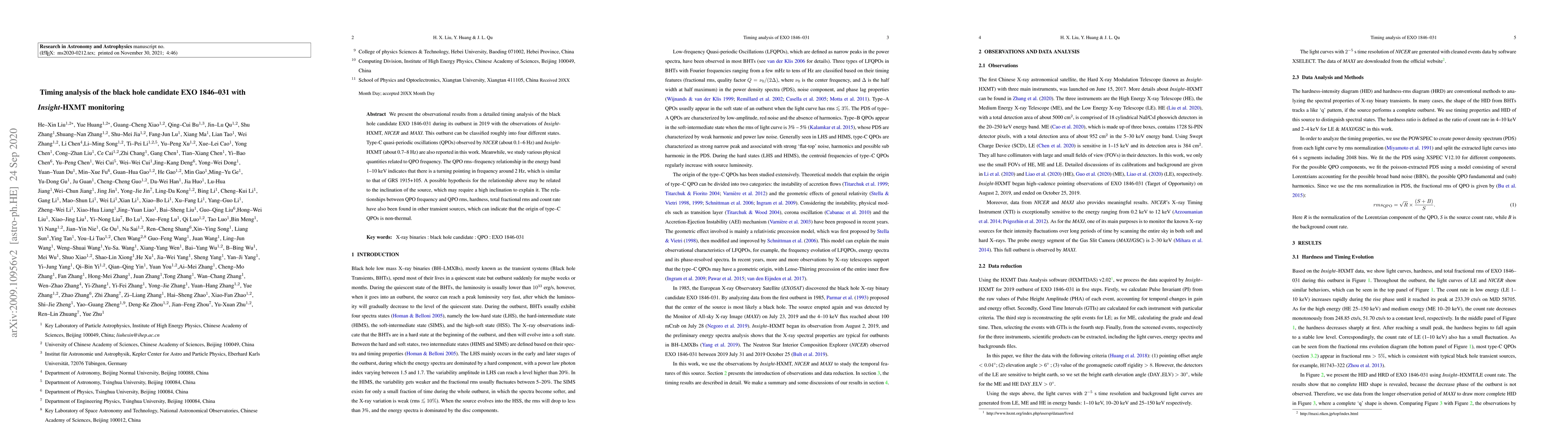 This study analyzes the timing characteristics of the black hole candidate EXO 1846-031 during its 2019 outburst using Insight-HXMT, NICER, and MAXI observations, identifying four distinct states and Type-C quasi-periodic oscillations. The research suggests a turning point in QPO frequency around 2 Hz, potentially linked to the source's high inclination, and indicates a non-thermal origin for these oscillations.