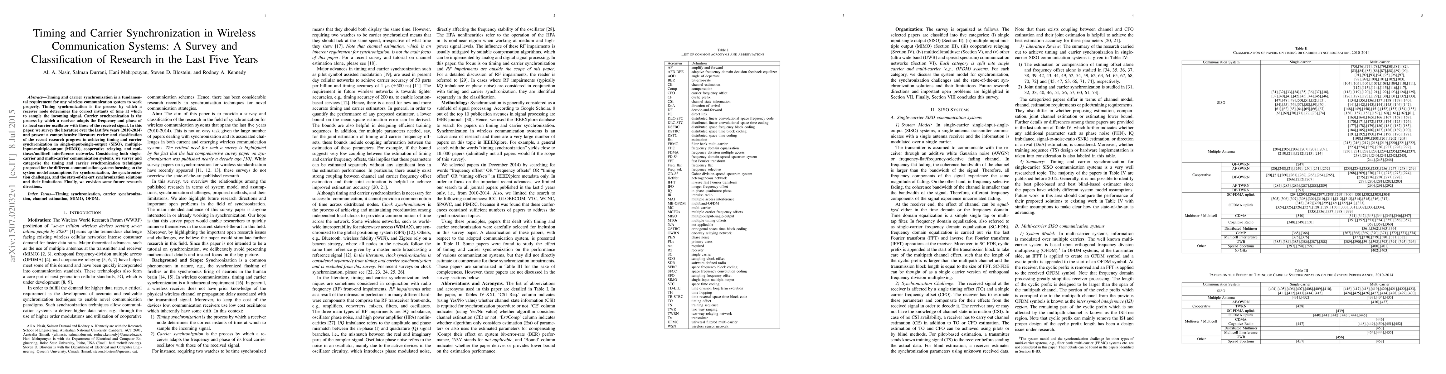 This paper surveys recent research on timing and carrier synchronization techniques in wireless communication systems from 2010-2014, focusing on SISO, MIMO, cooperative relaying, and multiuser/multicell networks. It categorizes synchronization methods, discusses challenges, and outlines future research directions.