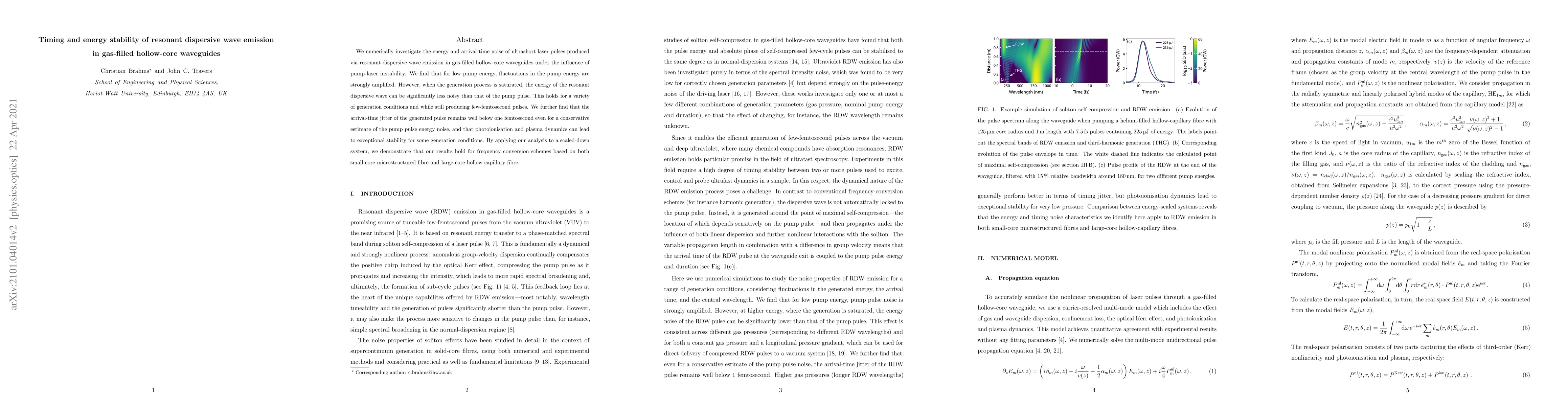 This paper investigates the stability of ultrashort laser pulses generated via resonant dispersive wave emission in gas-filled hollow-core waveguides, finding that low pump energy amplifies fluctuations but saturation leads to significantly less noisy pulses. The arrival-time jitter remains below one femtosecond, and exceptional stability can be achieved under certain conditions.