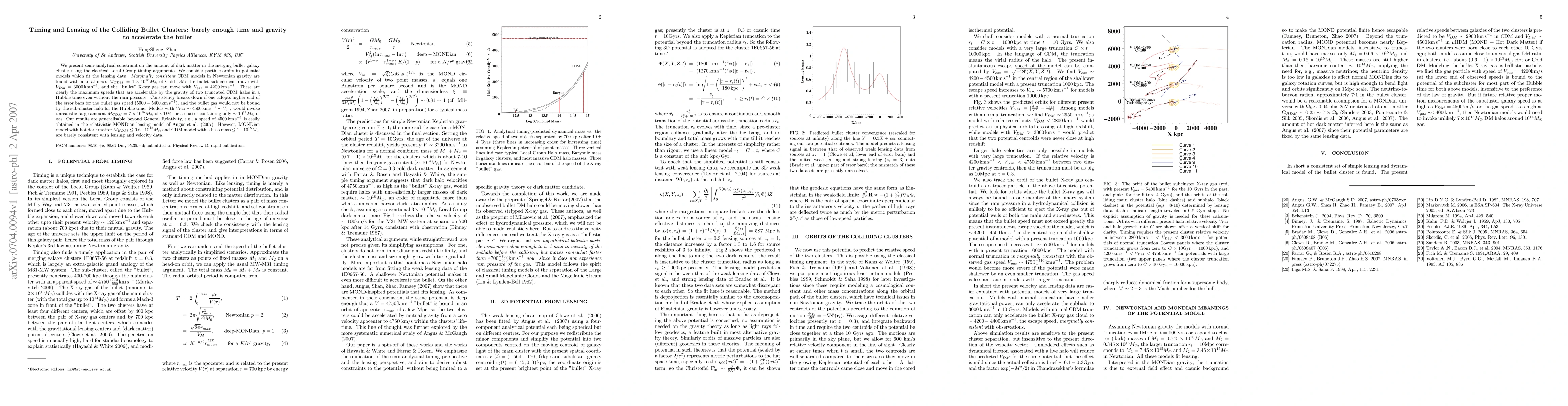 We present semi-analytical constraint on the amount of dark matter in the merging bullet galaxy cluster using the classical Local Group timing arguments. We consider particle orbits in potential models which fit the lensing data. {\it Marginally consistent} CDM models in Newtonian gravity are found with a total mass M_{CDM} = 1 x 10^{15}Msun of Cold DM: the bullet subhalo can move with V_{DM}=3000km/s, and the "bullet" X-ray gas can move with V_{gas}=4200km/s. These are nearly the {\it maximum speeds} that are accelerable by the gravity of two truncated CDM halos in a Hubble time even without the ram pressure. Consistency breaks down if one adopts higher end of the error bars for the bullet gas speed (5000-5400km/s), and the bullet gas would not be bound by the sub-cluster halo for the Hubble time. Models with V_{DM}~ 4500km/s ~ V_{gas} would invoke unrealistic large amount M_{CDM}=7x 10^{15}Msun of CDM for a cluster containing only ~ 10^{14}Msun of gas. Our results are generalisable beyond General Relativity, e.g., a speed of $4500\kms$ is easily obtained in the relativistic MONDian lensing model of Angus et al. (2007). However, MONDian model with little hot dark matter $M_{HDM} \le 0.6\times 10^{15}\msun$ and CDM model with a small halo mass $\le 1\times 10^{15}\msun$ are barely consistent with lensing and velocity data.