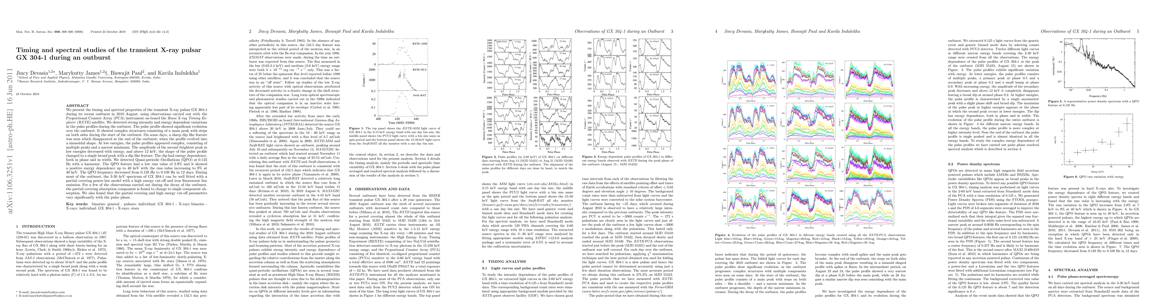 We present the timing and spectral properties of the transient X-ray pulsar GX 304-1 during its recent outburst in 2010 August, using observations carried out with the Proportional Counter Array (PCA) instrument on-board the Rossi X-ray Timing Explorer (RXTE) satellite. We detected strong intensity and energy dependent variations in the pulse profiles during the outburst. The pulse profile showed significant evolution over the outburst. It showed complex structures consisting of a main peak with steps on both sides during the start of the outburst. On some days, a sharp dip like feature was seen which disappeared at the end of the outburst; when the profile evolved into a sinusoidal shape. At low energies, the pulse profiles appeared complex, consisting of multiple peaks and a narrow minimum. The amplitude of the second brightest peak in low energies decreased with energy, and above 12 keV, the shape of the pulse profile changed to a single broad peak with a dip like feature. The dip had energy dependence, both in phase and in width. We detected Quasi-periodic Oscillations (QPO) at 0.125 Hz with a harmonic. The QPO feature had a low rms value of 2.9% and it showed a positive energy dependence up to 40 keV with the rms value increasing to 9% at 40 keV. The QPO frequency decreased from 0.128 Hz to 0.108 Hz in 12 days. During most of the outburst, the 3-30 keV spectrum of GX 304-1 can be well fitted with a partial covering power-law model with a high energy cut-off and iron fluorescent line emission. For a few of the observations carried out during the decay of the outburst, the partial covering absorption component is found to change to single component absorption. We also found that the partial covering and high energy cut-off parameters vary significantly with the pulse phase.