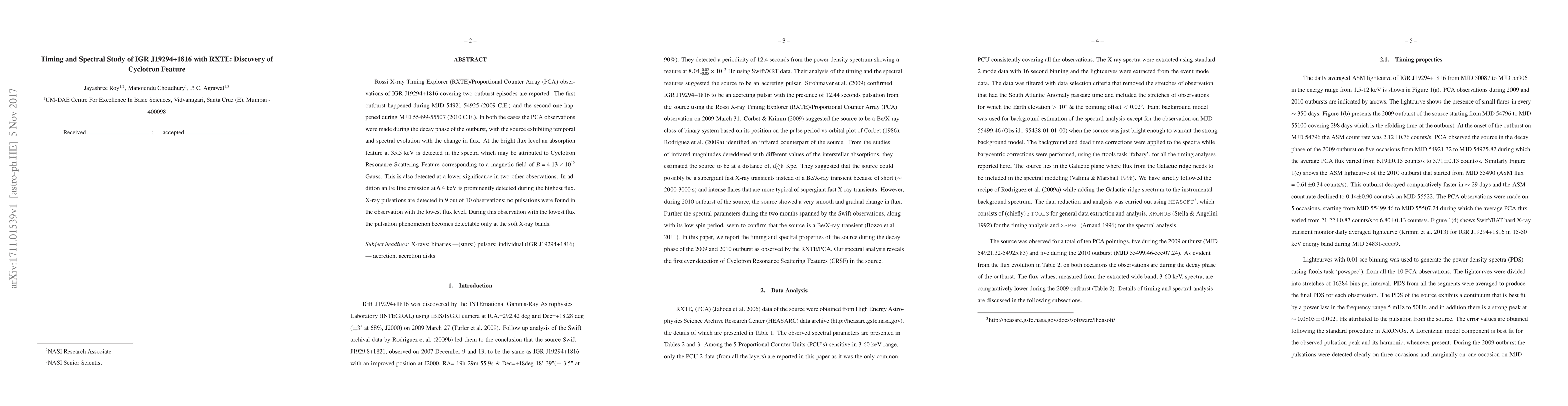 Rossi X-ray Timing Explorer (RXTE)/Proportional Counter Array (PCA) observations of IGR J19294+1816 covering two outburst episodes are reported. The first outburst happened during MJD 54921-54925 (2009 C.E.) and the second one happened during MJD 55499-55507 (2010 C.E.). In both the cases the PCA observations were made during the decay phase of the outburst, with the source exhibiting temporal and spectral evolution with the change in flux. At the bright flux level an absorption feature at 35.5 keV is detected in the spectra which may be attributed to Cyclotron Resonance Scattering Feature corresponding to a magnetic field of B = 4.13*10^12 Gauss. This is also detected at a lower significance in two other observations. In addition an Fe line emission at 6.4 keV is prominently detected during the highest flux. X-ray pulsations are detected in 9 out of 10 observations; no pulsations were found in the observation with the lowest flux level. During this observation with the lowest flux the pulsation phenomenon becomes detectable only at the soft X-ray bands.