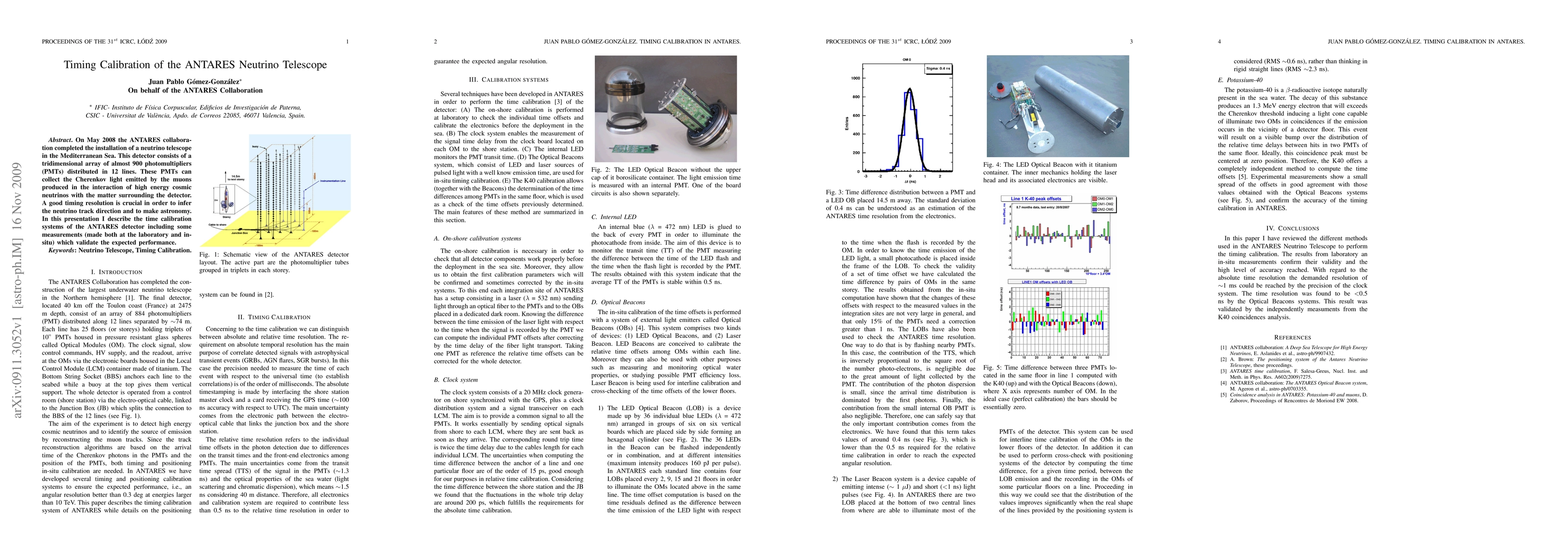 The ANTARES neutrino telescope, installed in the Mediterranean Sea in May 2008, uses an array of 900 photomultipliers to detect Cherenkov light from high-energy cosmic neutrino interactions. This paper details the timing calibration systems of the detector, highlighting both laboratory and in-situ measurements that validate its expected performance.