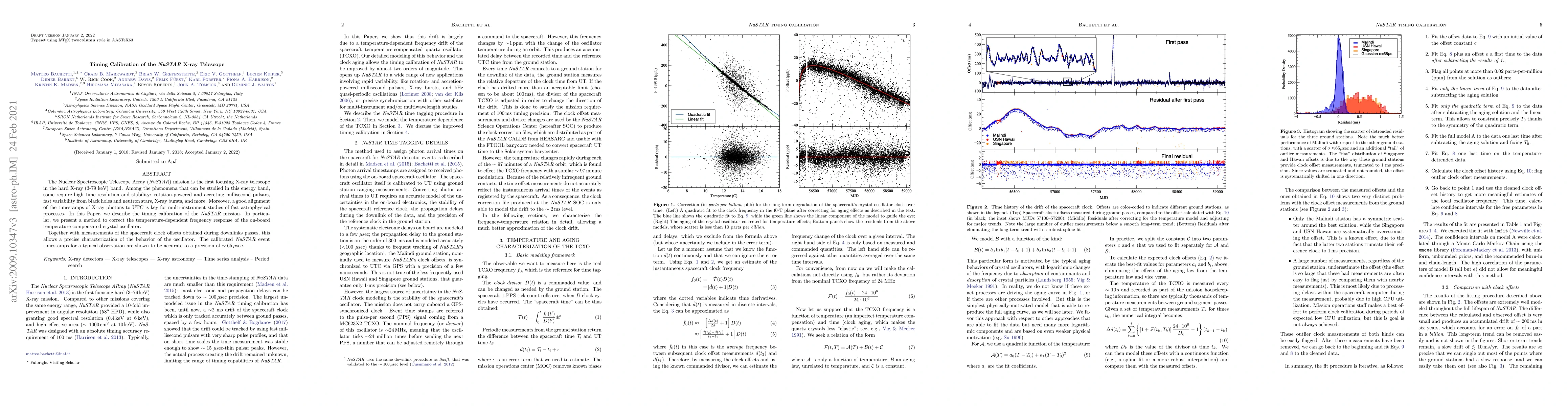 This paper details the timing calibration of the NuSTAR X-ray telescope, focusing on correcting the temperature-dependent frequency response of its onboard oscillator. The calibration method, combined with spacecraft clock offset measurements, enables precise timestamping of X-ray events with an accuracy of approximately 65 microseconds.