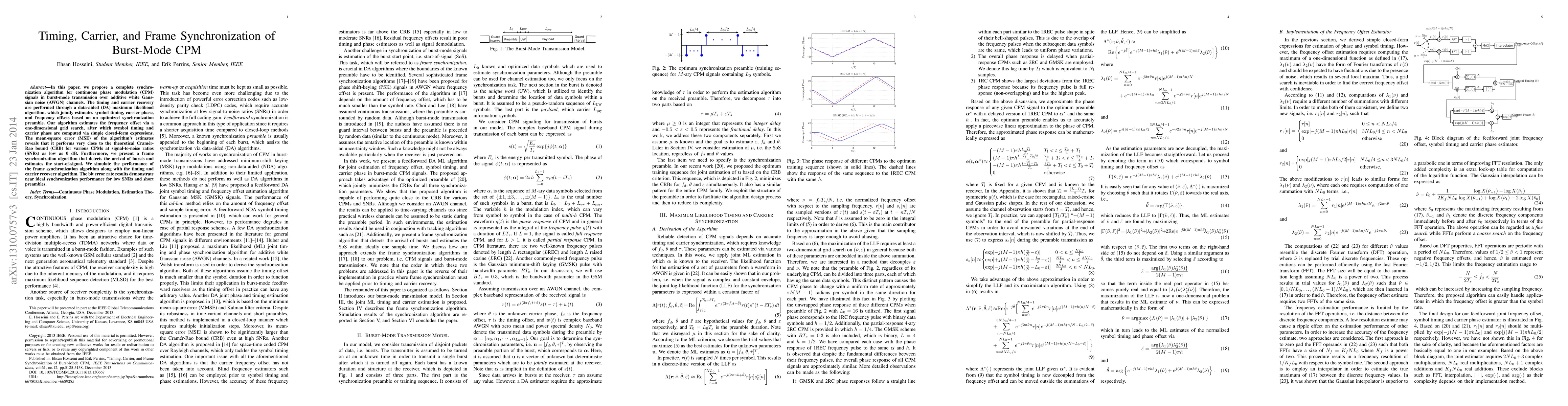 This paper presents a synchronization algorithm for burst-mode continuous phase modulation (CPM) in AWGN channels, achieving near-optimal performance via a data-aided maximum likelihood approach. It also introduces a frame synchronization method for detecting burst arrivals, demonstrating near-ideal performance in low SNR conditions.