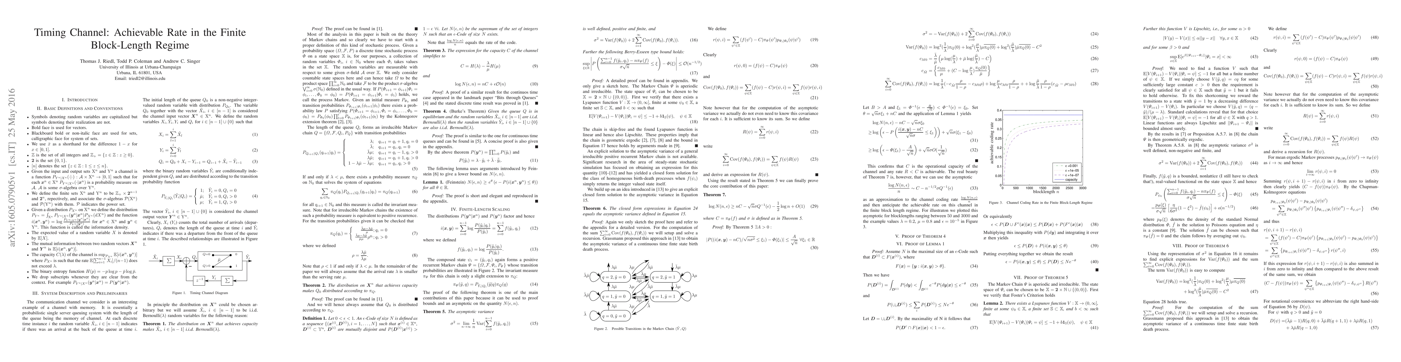 The exponential server timing channel is known to be the simplest, and in some sense canonical, queuing timing channel. The capacity of this infinite-memory channel is known. Here, we discuss practical finite-length restrictions on the codewords and attempt to understand the maximal rate that can be achieved for a target error probability. By using Markov chain analysis, we prove a lower bound on the maximal channel coding rate achievable at blocklength $n$ and error probability $\epsilon$. The bound is approximated by $C- n^{-1/2} \sigma Q^{-1}(\epsilon)$ where $Q$ denotes the Q-function and $\sigma^2$ is the asymptotic variance of the underlying Markov chain. A closed form expression for $\sigma^2$ is given.