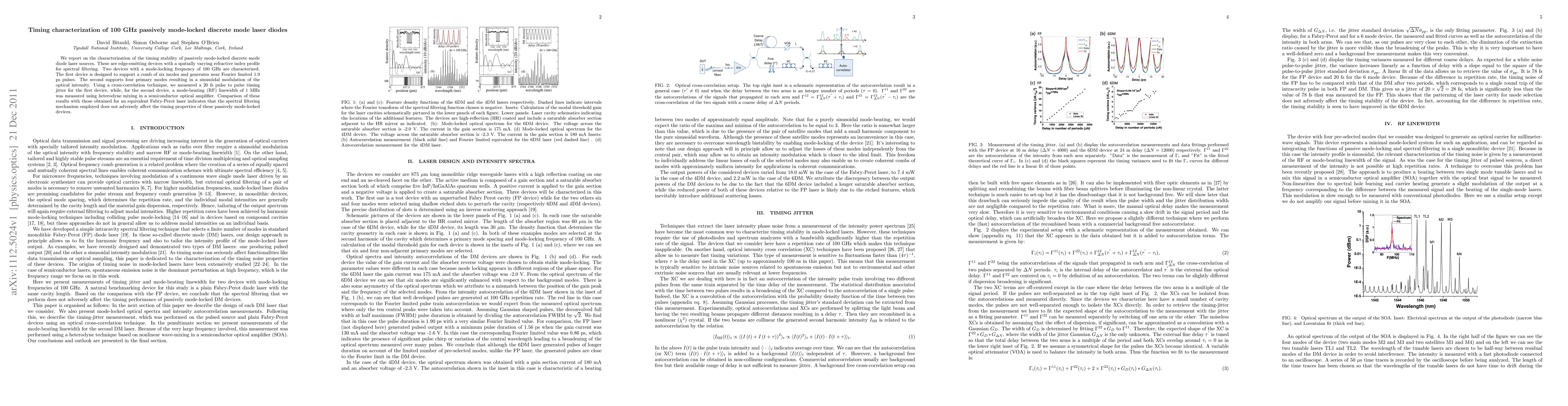We report on the characterization of the timing stability of passively mode-locked discrete mode diode laser sources. These are edge-emitting devices with a spatially varying refractive index profile for spectral filtering. Two devices with a mode-locking frequency of 100 GHz are characterized. The first device is designed to support a comb of six modes and generates near Fourier limited 1.9 ps pulses. The second supports four primary modes resulting in a sinusoidal modulation of the optical intensity. Using a cross-correlation technique, we measured a 20 fs pulse to pulse timing jitter for the first device, while, for the second device, a mode-beating (RF) linewidth of 1 MHz was measured using heterodyne mixing in a semiconductor optical amplifier. Comparison of these results with those obtained for an equivalent Fabry-Perot laser indicates that the spectral filtering mechanism employed does not adversely affect the timing properties of these passively mode-locked devices.