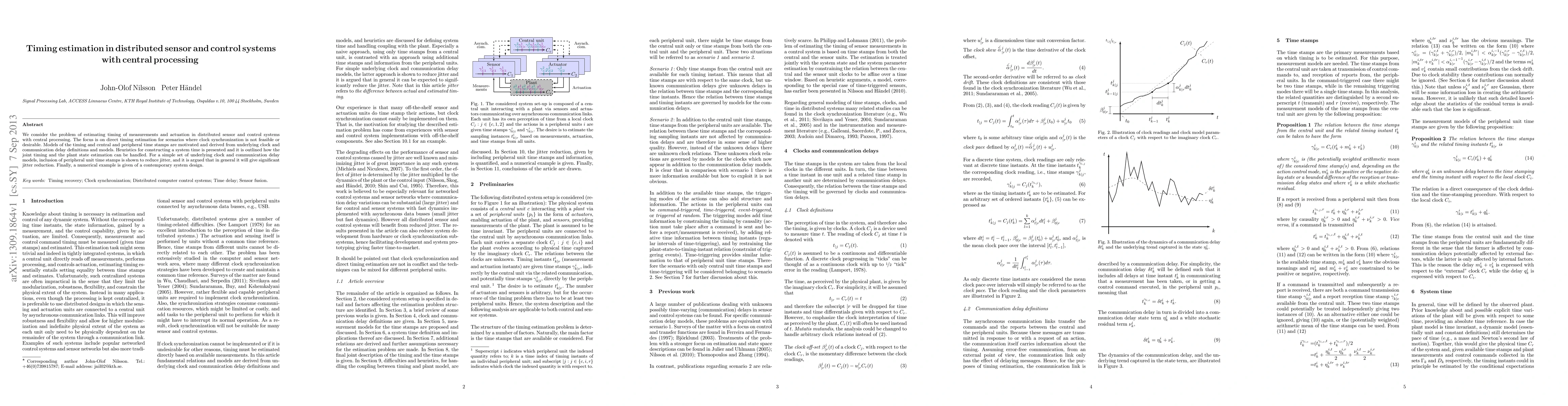 We consider the problem of estimating timing of measurements and actuation in distributed sensor and control systems with central processing. The focus is on direct timing estimation for scenarios where clock synchronization is not feasible or desirable. Models of the timing and central and peripheral time stamps are motivated and derived from underlying clock and communication delay definitions and models. Heuristics for constructing a system time is presented and it is outlined how the joint timing and the plant state estimation can be handled. For a simple set of underlying clock and communication delay models, inclusion of peripheral unit time stamps is shown to reduce jitter, and it is argued that in general it will give significant jitter reduction. Finally, a numerical example is given of a contemporary system design.