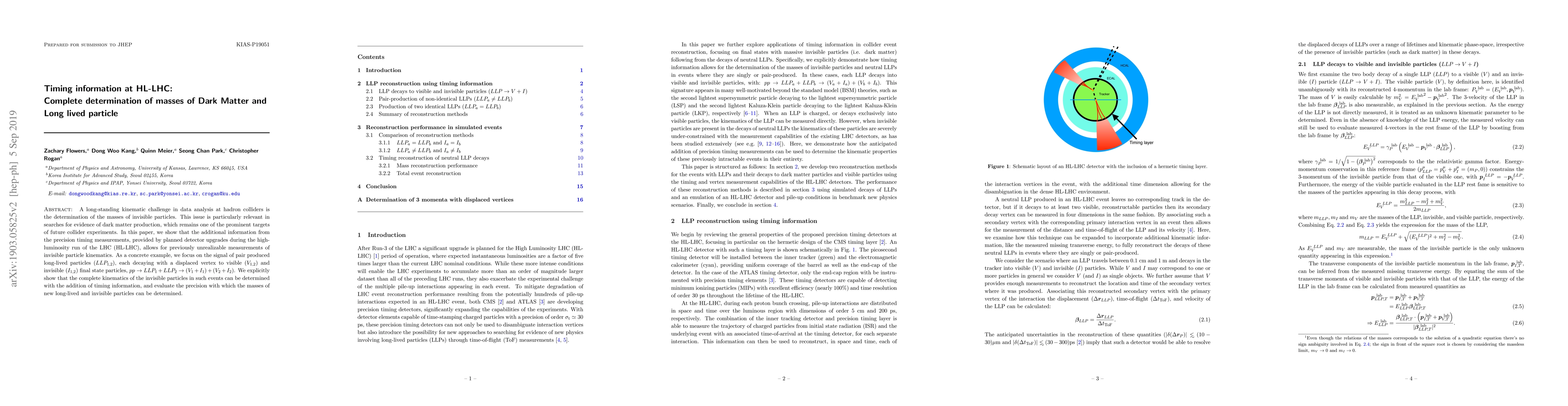 A long standing problem in kinematics at the hadron colliders is to determine the mass of invisible particles. This issue is particularly important for the signals of dark matter, which becomes one of the prominent targets of future collider experiments. In this paper, we show that the additional information from the precise timing measurement, which will be available at the planned high-liminosity run of the LHC (HL-LHC), will shade new light on the kinematics study. As a concrete example, we focus on the signal of the pair produced long-lived particles ($LLP_{1,2}$), respectively leaving displaced vertex with visible ($V_{1,2}$) and invisible ($I_{1,2}$) final state, $pp \to LLP_1+LLP_2 \to (V_1+I_1)+(V_2+I_2)$. We explicitly show that this system is completely solvable with timing information.