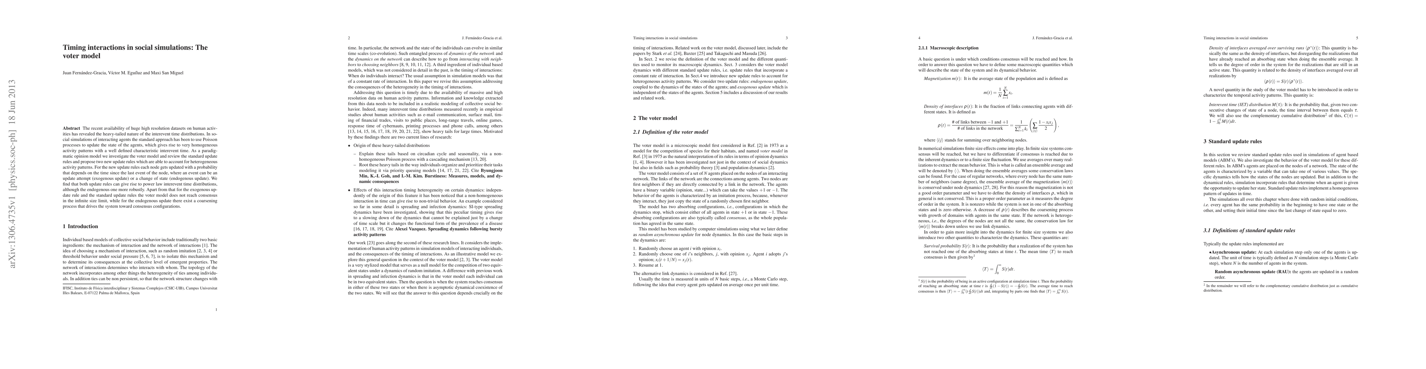 The recent availability of huge high resolution datasets on human activities has revealed the heavy-tailed nature of the interevent time distributions. In social simulations of interacting agents the standard approach has been to use Poisson processes to update the state of the agents, which gives rise to very homogeneous activity patterns with a well defined characteristic interevent time. As a paradigmatic opinion model we investigate the voter model and review the standard update rules and propose two new update rules which are able to account for heterogeneous activity patterns. For the new update rules each node gets updated with a probability that depends on the time since the last event of the node, where an event can be an update attempt (exogenous update) or a change of state (endogenous update). We find that both update rules can give rise to power law interevent time distributions, although the endogenous one more robustly. Apart from that for the exogenous update rule and the standard update rules the voter model does not reach consensus in the infinite size limit, while for the endogenous update there exist a coarsening process that drives the system toward consensus configurations.